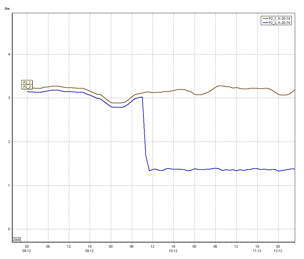 Цитата(Midial @ 12.10.2013, 21:24)  2A.R: Предлагаю Вам отложить пока в сторону книги и постараться своим умом понять, что я Вам написал, что такое насос, во что он преобразует электрическую энергию, для чего нужен в замкнутом контуре. ... Безусловно, меняя место установки насоса, можно изменять давления на участках сети, и вполне можно сказать, что изменив положение насоса, мы уменьшили давление. Но утверждать на полном серьёзе, что сам насос уменьшает давление... Проблема в том, что Вы воспринимаете насос как отдельно взятое техническое устройство. Конечно же, насос как таковой давление только повышает. И давление на всасе всегда меньше давления на напоре. И электрическую энергию насос в конечном итоге преобразует в нагрев перекачиваемой жидкости. Но речь то шла не об этом: Цитата(A.R. @ 11.10.2013, 7:45)  ...И насос в закрытой системе, в зависимости от места установки может как повышать, так и понижать давление. А о возможности снижать давление в системе используя насос. И Вы с этим всё-же соглашаетесь (с непонятными оговорками). И пользуются люди такой возможностью и в тепловых сетях и в отдельно взятых системах десятилетиями (и я в том числе). Не надеясь на своё умение объяснять подробнее, обещанные сканы прилагаю. Сканави и Манюк попроще будут, Зингер серъёзной подготовки требует. Приложу также интересную картинку наглядно показывающую процесс уменьшения давления. Два датчика давления в камере тепловых сетей к которой подключена ПНС. Датчики врезаны с двух сторон обратного клапана. Насосная строилась для снижения давления в обратке у потребителей. Предназначение у неё такое было. Показания снимались при пуске насосной. До пуска насосной оба датчика показывают одно и то же давление. Некоторая разница объясняется их (датчиков) недостаточной точностью. В момент пуска насосной давление на всасе насосов (со стороны потребителей) снижается.Давление на напоре насосов (со стороны источника) остаётся неизменным. Оно и не должно меняться, ибо зафиксировано регулятором подпитки теплоисточника. В системах отопления ситуация аналогична. Надо только знать где давление зафиксировано и где насос установлен. Для SSN: Может быть эта картинка и на Ваши вопросы частично ответит.