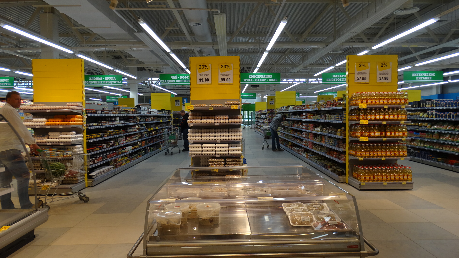 В нем зал 300м2 со продуктами поделенный на зоны.Но окон нет.и вдоль почти всех стен стоят холодильники или стеллажи с продуктами.