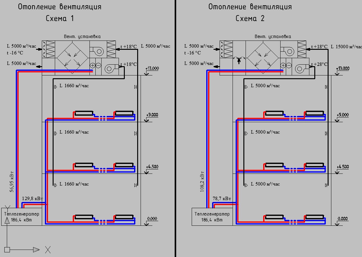 Планируется радиаторное отопление и вентиляция (про кондиционирование пока речь не идет), но тут возникает вопрос: может радиаторную систему отопления сделать на поддержание температуры в помещениях плюс 5 (дежурное, ночное отопление требуется 79 кВт), а остальную нагрузку возложить на систему вентиляции (воздушное отопление) или не заморачиваться и делать полноценное радиаторное отопление на всю мощность а вентиляционный воздух греть до температуры внутренних помещений. При этом ночью вентиляция будет выключаться в обоих случаях а водяная система отопления во втором случае будет поджиматься.