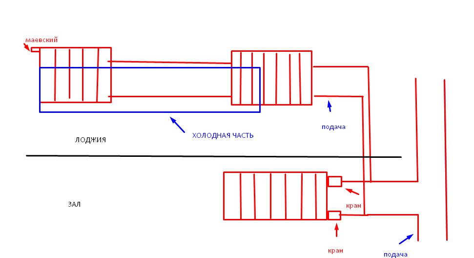 Мы на связке цепляли вторую батарею одному чуваку, по большому блату. У него угол комнаты слегка промерзал, а стояки по углам нынче почему-то проектировщики располагать стесняются. Или по нормам нельзя. Короче, жопа была, промерзал угол. Подающую подводку уводили на нел ( на вторую батарею), в дальний верхний угол, а обратка штатная от проектной батареи. Работает.