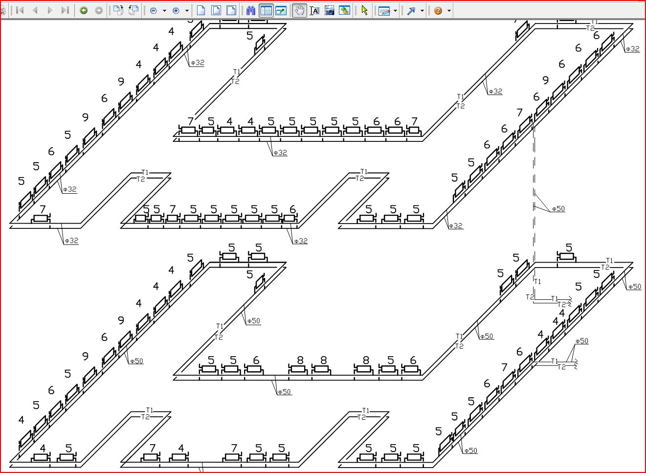 схема странная, каждый радиатор сажается на трубу одного диаметра, где бы он не находился, на сколько бы не был удален от элеваторного узла. Верхние приборы явно расположены дальше от элеватора но сажаются на Ду32 или это пластик по наружке обозначен. система в принципе рабочая. Одно но, настроить ее будет также сложно как и понимать по какой причине делалась такая неграмотная схема. Закольцованная подача и обратка, они будут творить чудеса в купе с термостатическими регуляторами. Скажите в каком учебном заведении учат так проектировать. Чертеж кстати тоже не грамотен, я бы со стыда сгорел при выдаче такого.