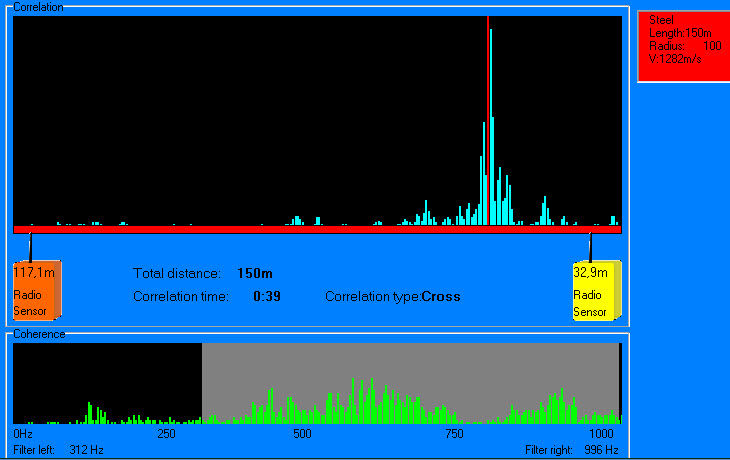Определить на практике местоположение задвижки трассопоиском проблематично (даже глубина залегания не всегда корректно определяется) – может потому, что чугун (стыки) или оператор не пианист……. Нажмите для просмотра прикрепленного файлаНажмите для просмотра прикрепленного файла На коррелограммах представлены места двух утечек. О чем собственно и свидетельствует четкий максимум на кривых корреляции. В нижних окнах когерентности видим различные картинки по уровню спектральных составляющих. Возникает вопрос с когерентностью. Она высокая там, где на обоих каналах имеются общие спектральные составляющие. Поэтому фильтром выделяем частоты с высоким уровнем. В результате появляются изменения на коррелограмме.