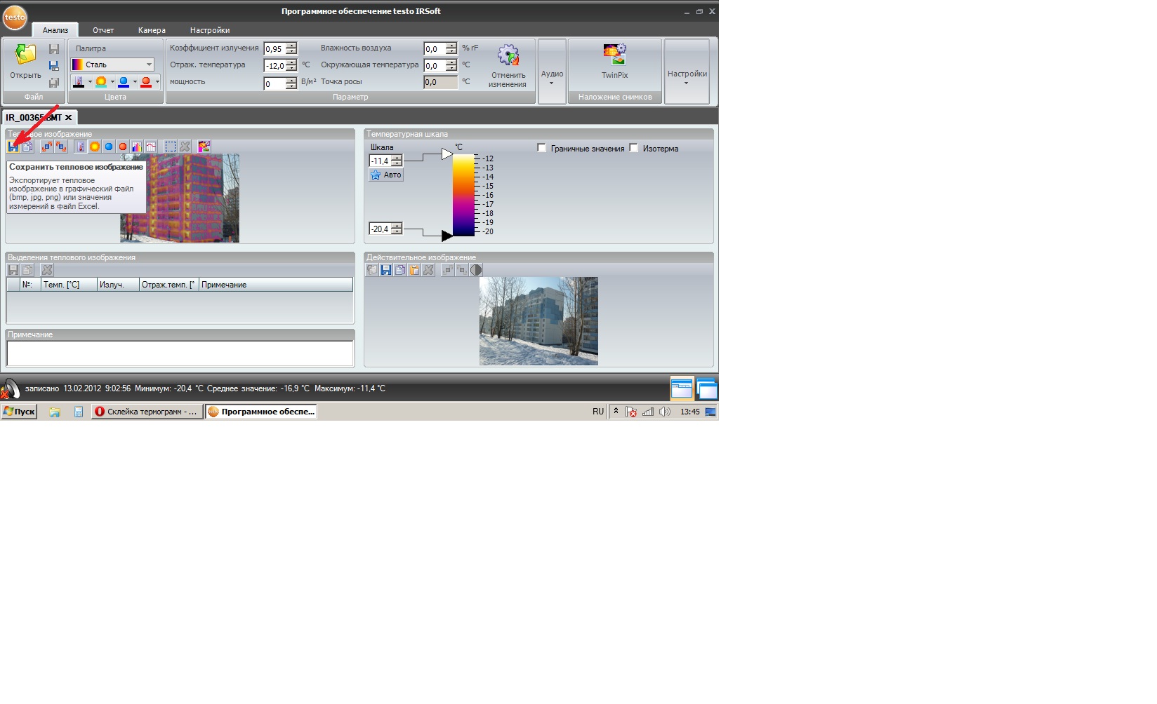 Спасибо. Но рисунки сохраняются без радиометрических данных, а мне как раз необходимо сохранение радиометрических данных, что бы к примеру я мог их открыть в FLIR QuickReport, к примеру рисунок прикрепленный ниже сделанный flir тепловизором, открывается с показаниями всех температур, а сохранненный через testo нет рис.3.