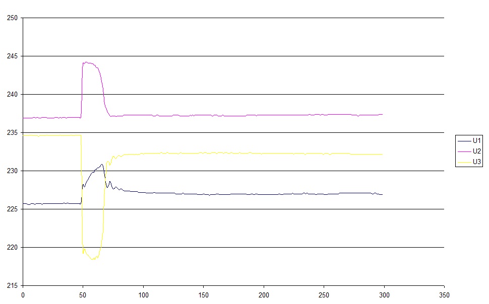 По поводу графика - посмотрите нагрузку по току в момент перенапряжения. Складывается ощущение, что когда включают нагрузку на фазе красной, падает напряжение на ней, а в трансформаторе в это время происходит перераспределение магнитных полей и как следствие скачок напряжения на зелёной фазе.