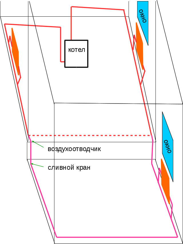 Дано: частный 1 этажный дом с высоким цоколем, в цоколе котел. от котла на 1 этаж идет 40 труба, немного поднимаеться над полом, c некоторым уклоном обходит дом по периметру, и возвращаетсяь в котел. К трубе сверху вварены радиаторы. (ленинградка, без заужения магистрали). Расширительный бак присутствует тоже. Система работает как ЕЦ и всех устраиваент как.