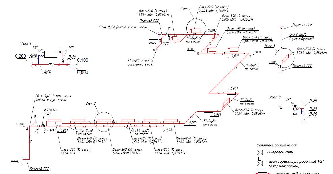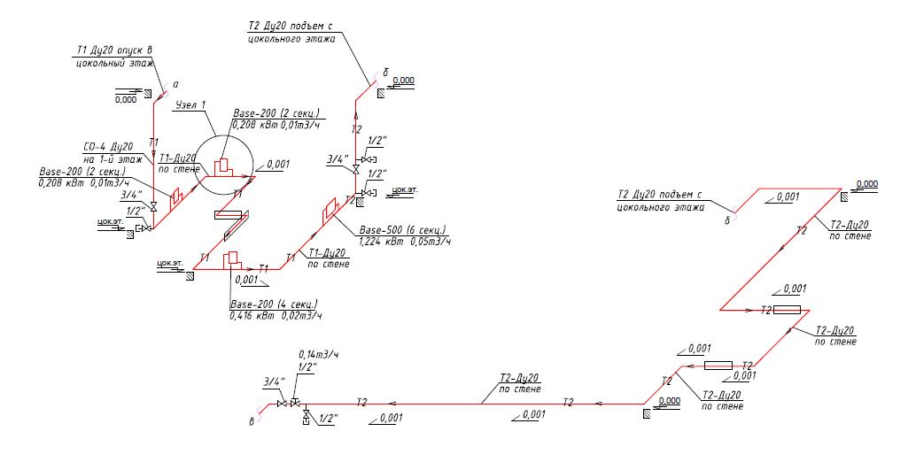 Предложили смонтировать небольшую систему отопления. Вроде подход должен быть "Делай все по чертежу..." и далее по тексту, но гложут сомнения. Больно уж странный проект нарисовали. Есть то, что называют сейчас "коммерческая встройка", дом жилой, 80-х годов постройки, отдельный элеваторный узел в ИТП на эти встроенные помещения. Большой магазин советских времен разгородили на отдельные площади, получились неравные части когда-то целого, система отопления - горизонтальная однотрубка, общая на эту часть встройки, раздел где-то - три четверти тут, остальное - у других хозяев. В оригинале в этих помещениях было 9 стальных панельных советских радиаторов, до начала в соседнем помещении еще 2, и после конца дальше еще 4. В цокольном этаже отопление не было сделано вообще. Все было разведено сталью ДУ20. Потом часть радиаторов поменяли на алюминий, часть труб переложили на полипропилен 25 мм, но в целом концепцию сохранили. В нынешнем проекте хотят от начала нашей зоны ответвиться на цокольный этаж, а по первому - добавить радиаторов, и около витрин добавить их побольше, сделав гибрид однотрубки и двухтрубки. А после этого - те же 4 радиатора у соседей остаются... В принципе, скорость в трубе ДУ20 получается около 0,8 м/с, при суммарном расходе по двум веткам порядка 0,9 тонн в час. Длина этого всего хозяйства в пространстве около 30 метров, ширина - 10, с подъемами и опусками до ИТП - суммарная длина ветки что-то вроде 80 метров. На радиаторах входные температуры 72, 68, 64, 62, 57, 55, 53 градуса, что вроде как нормально для однотрубки. То есть, в ИТП с элеватора явно выходит что-то на пределе уже сейчас, при этом на улице около 0, а в помещении - где-то +16, заказчик говорит - холодно! Изначально тут был промтоварный магазин, теперь по ТЗ должно быть 22 градуса. И вот будет ли работать тот гибрид, что проектировщики придумали - есть сомнения... Два кольца, до и после остается чужая однотрубка... У них что первый, что четвертый, что шестой радиатор (одинаковые) имеют одну и ту же теплоотдачу, при том, что температура на их входе будет явно не одна и та же, и не 95/85, как по заводским данным. В общем, стоит ли за эту авантюру браться? Как-то не хочется постфактум доказывать, что все сделано по проекту, и все претензии не ко мне, лучше уж заранее понять - может, что-то не так?