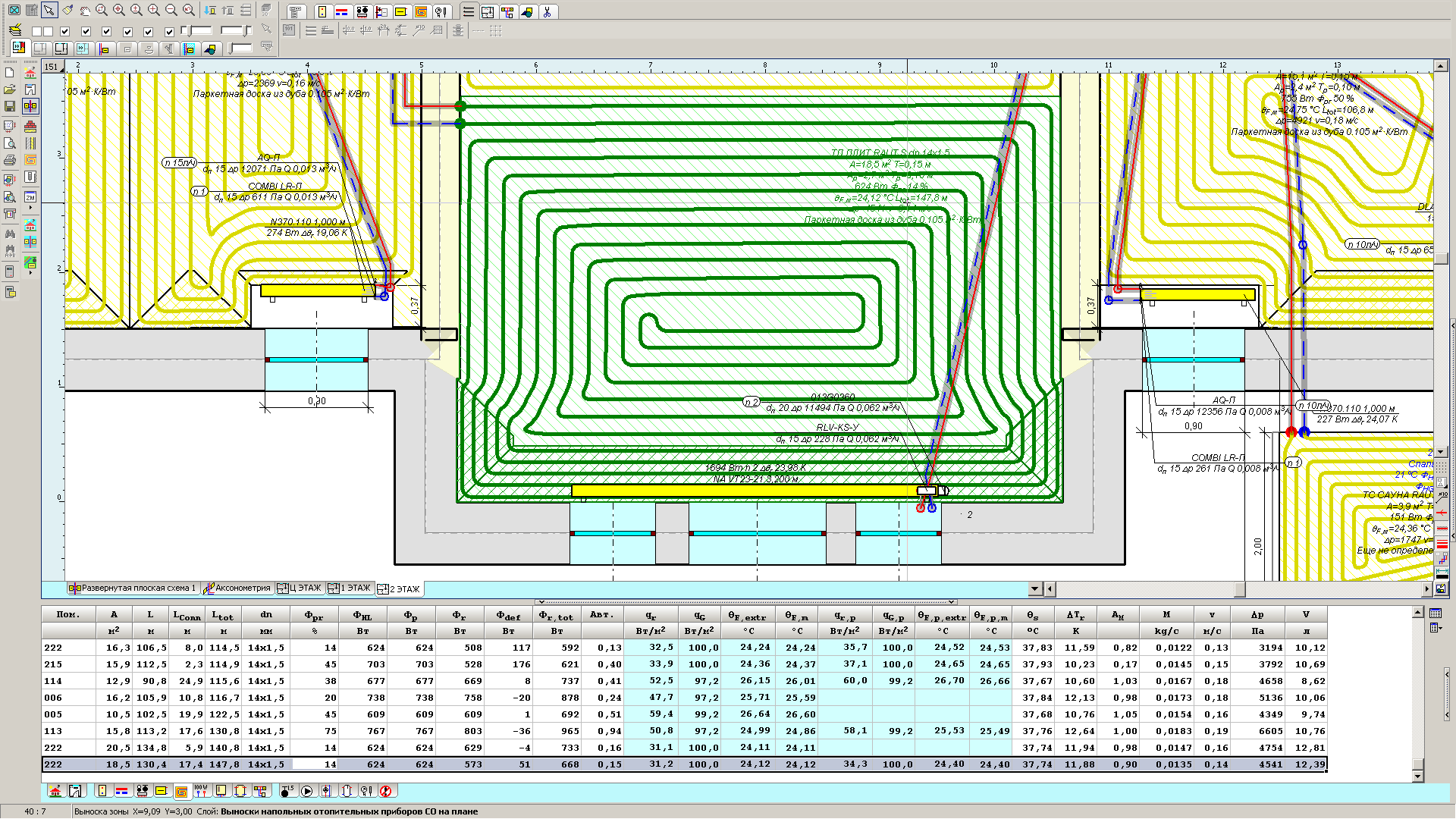 Но ведь дело то не в длине, а какие будут потери в этом контуре. К примеру ниже у меня контур длиной почти 150 метров сделанный из трубы 14х1,5мм. И его потери 4,5 кПа, что приемлемо было. Напор насоса конечно получился 44 кПа и насос восьмиметровый, но это для трех этажей с общей площадью ВТП около 500 м2 да еще водяные теплые стены. Да еще на балансировочниках сделал падение давления около 10 кПа.