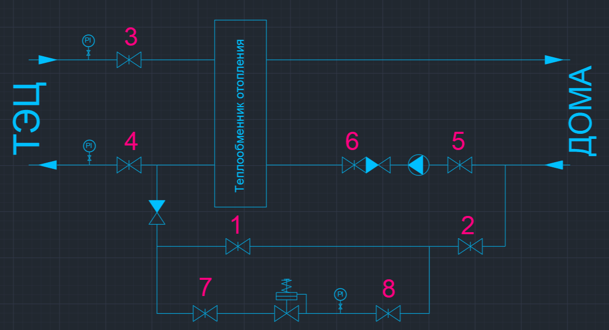 Набросал фактическую схему, за исключением всего лишнего. Номера задвижек/шаровых кранов проставил чтоб было легче понимать друг друга. Также обозначил обратные клапана и сам редуктор (надеюсь обозначения правильные). Можно было бы подозревать низкое давление перед редуктором, но при открытии шарового крана (1 на схеме), давление в обратке 2 контура (отопления) начинает возрастать и стремиться сравняться с давлением обратки 1 контура (с тэц), соответственно начинает возрастать давление на подаче 2 контура.