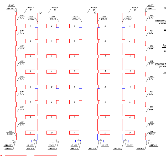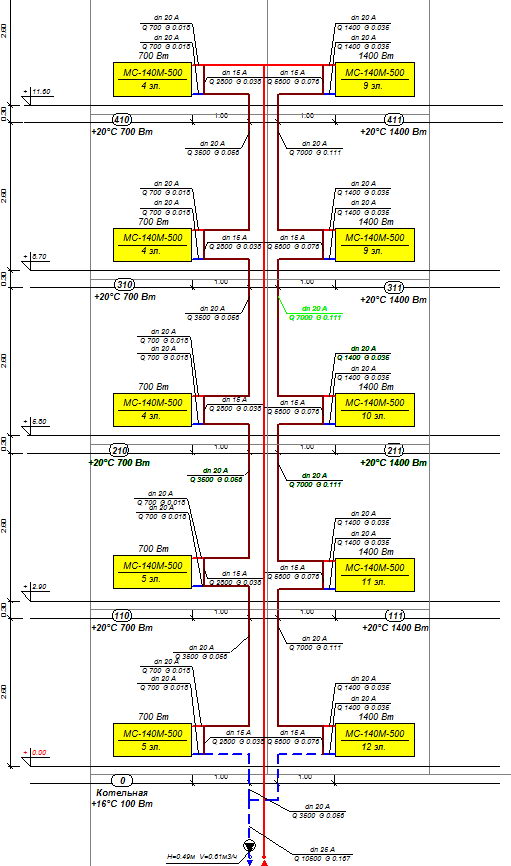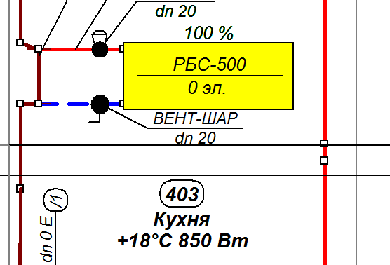 Я вставляла готовые блоки - однотрубный с верхней раздачей и однотрубный с нижней раздачей. Задавала прибор Сантехкомплект РБС-500. Потом это дело копировала.