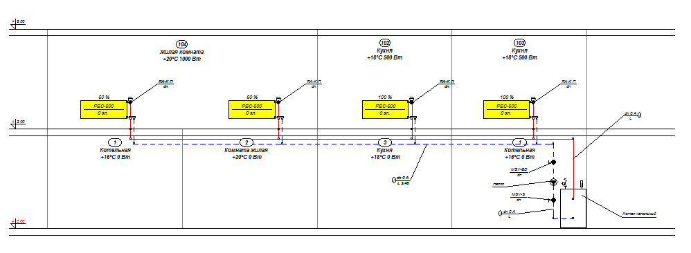 Заложена горизонтальная двухтрубная тупикова система отопления, и у каждого прибора стоят RTD-N-П и RLV-П.