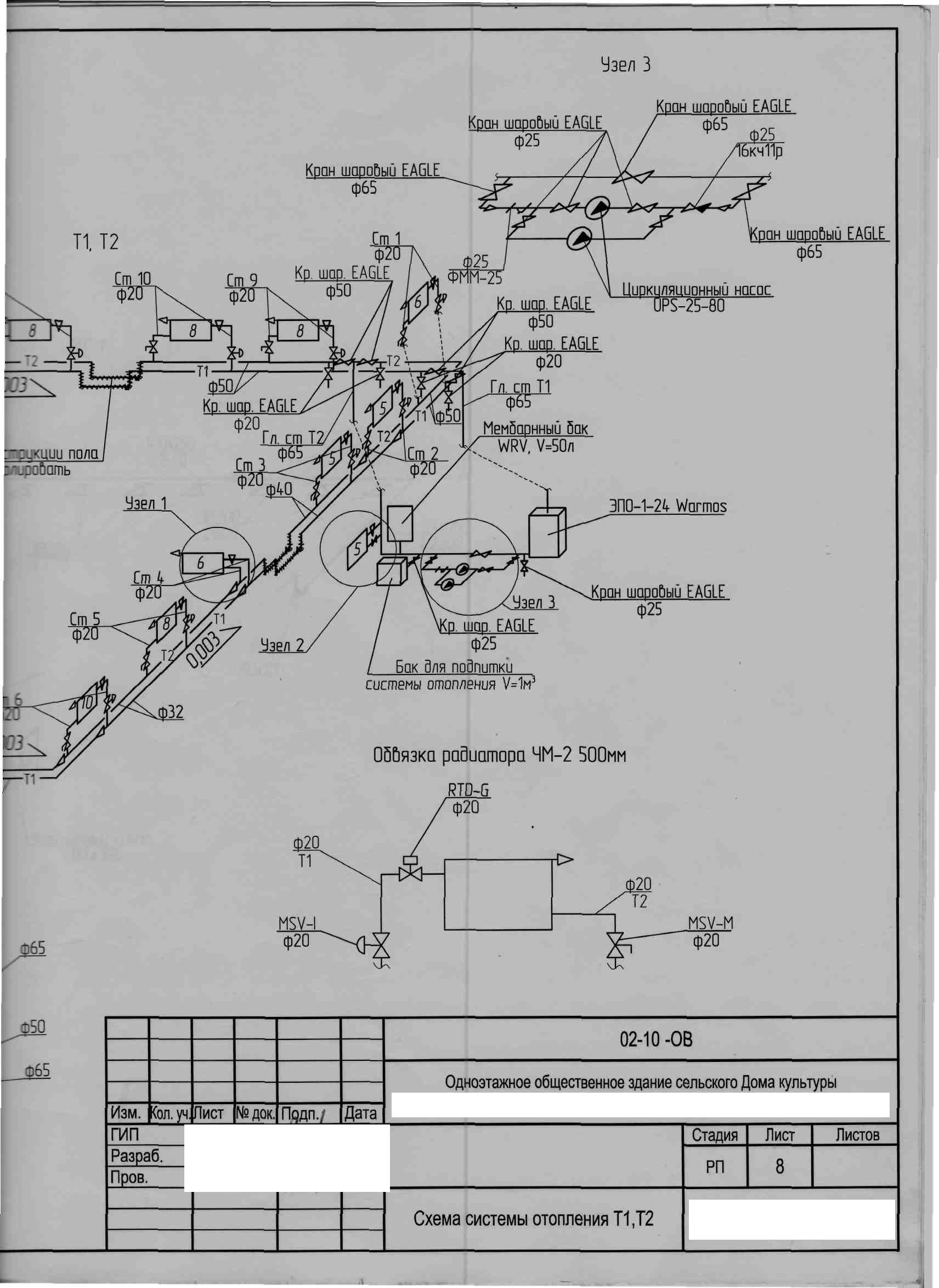 Есть проект одноэтажного здания сельского ДК площадью 300 м2 с полами по грунту и тех подвалом размером в плане 3х8 м. Проектировщики приняли на обвязку радиаторов Данфосовские: на подачу - термостатический вентиль типа RTD-N, ручной балансировочный клапан типа MSV-I, на обратку - запорный клапан типа MSV-M. Насос UPS-25-80. По гидравлическому расчету выбраны трубы Ду65 - Ду20. Схема прилагается.