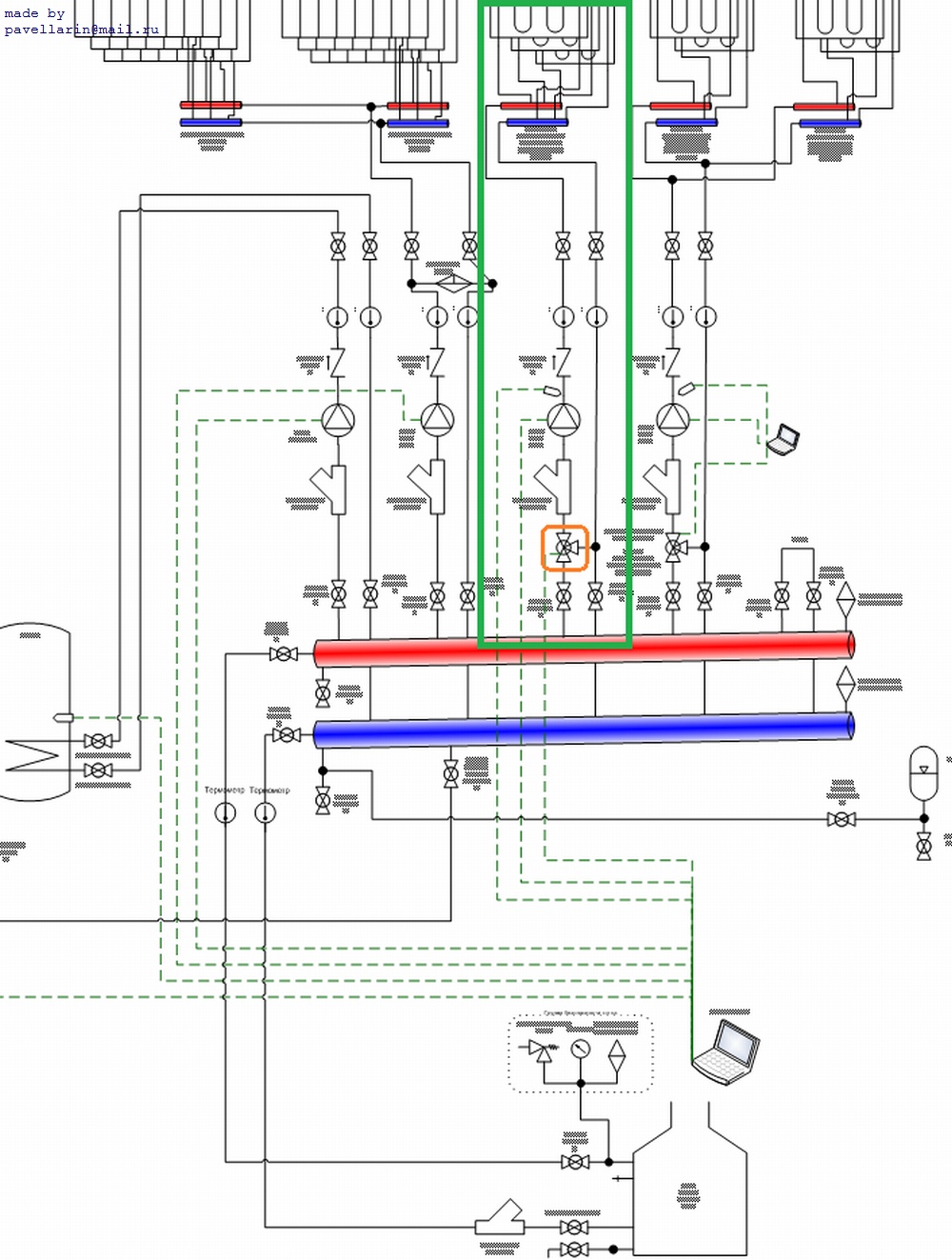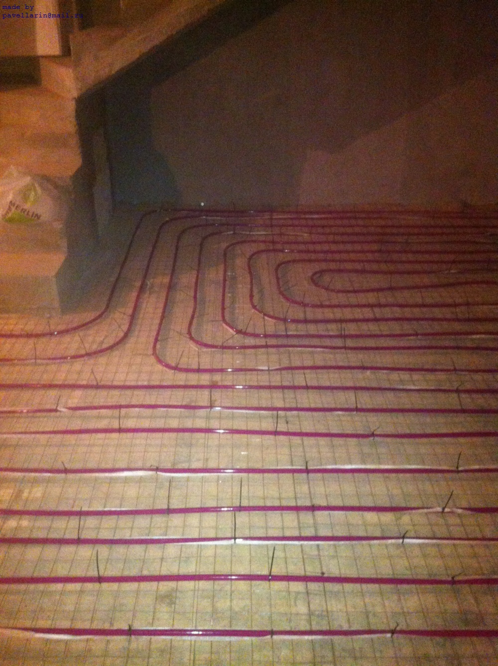 В доме уложено 5 петель, их длины 68+82+93+79+46м. Труба Rehau-pink 16. Уложены улитками. Подключены через коллектор, подвод к которым выполнен медной трубой 20мм.