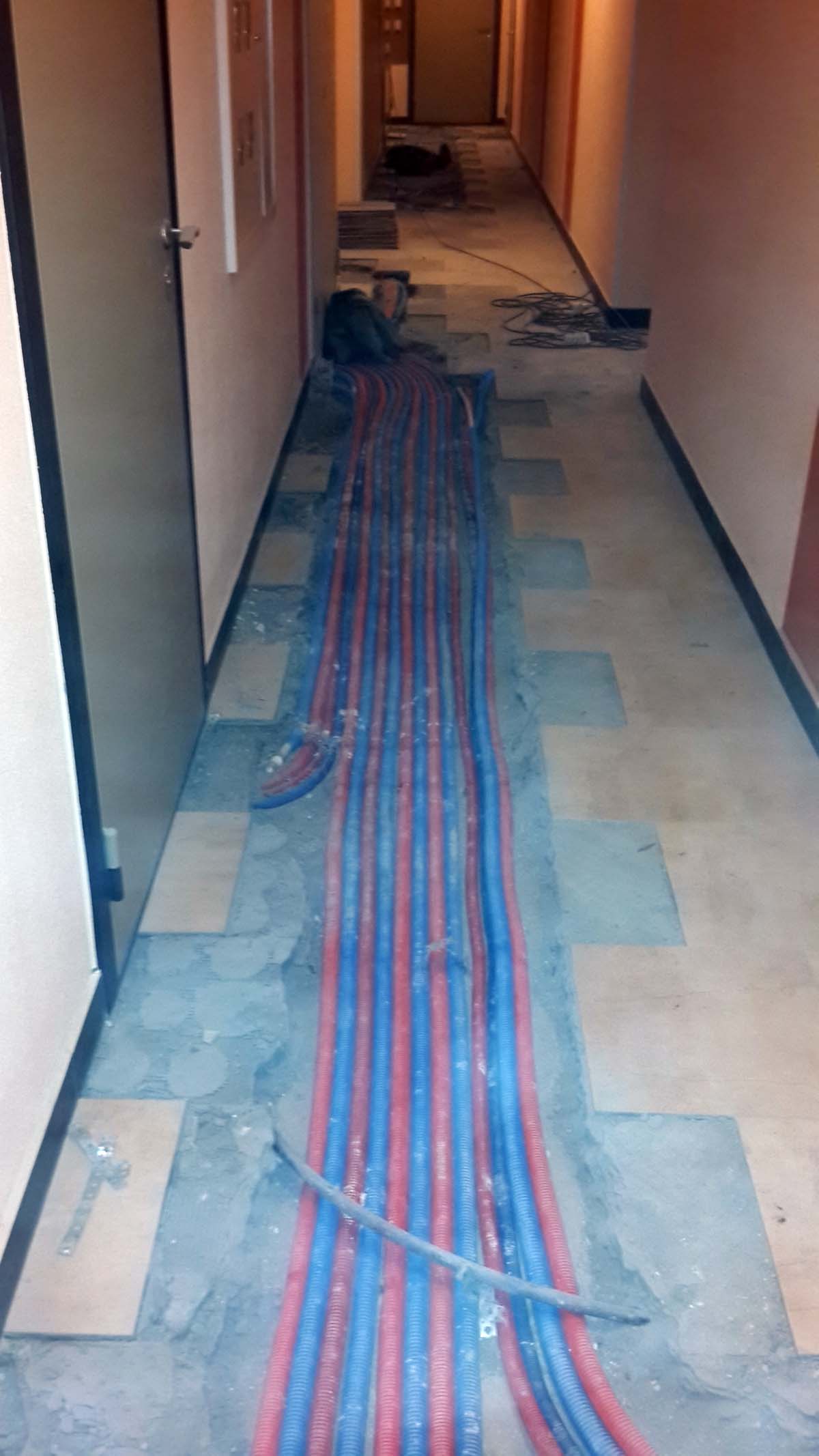 Разводка отопления и водоснабения горизонтальная, по полу, из тех.ниш в коридорах.