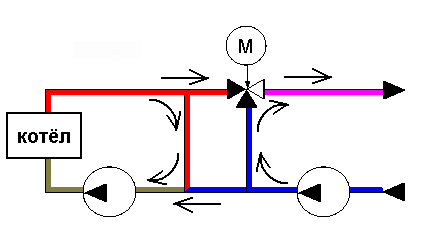 Вообще, если в локальной системе есть свой теплоисточник, выгоднее качественное регулирование теплоснабжения, а смешение потоков имеет смысл только на отдельных низкотемпературных ветвях схемы. Самая лучшая схема - один-два циркуляционных насоса, а дальше регулировка ветвей балансировочными кранами или затворами.