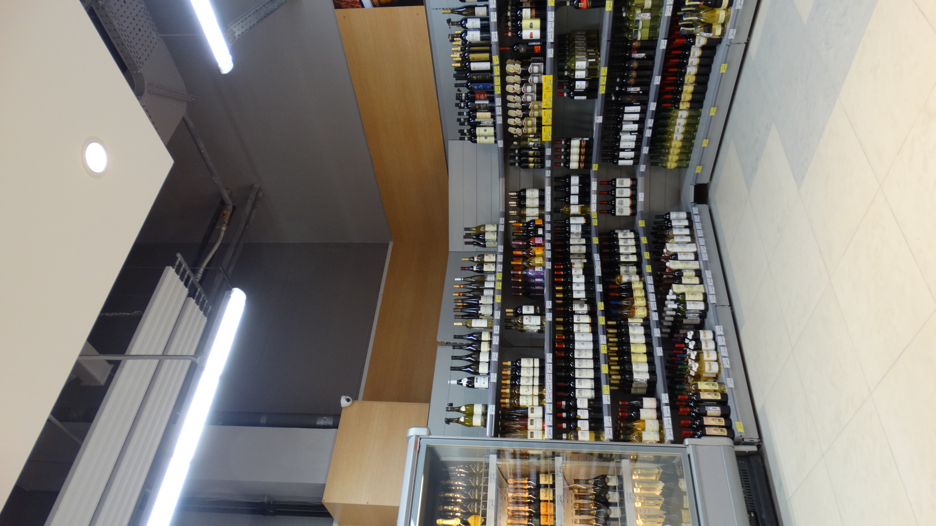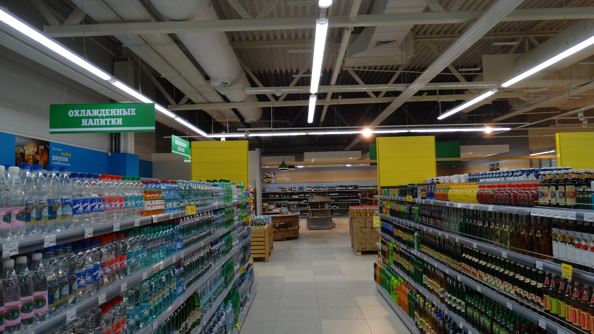 В нем зал 300м2 со продуктами поделенный на зоны.Но окон нет.и вдоль почти всех стен стоят холодильники или стеллажи с продуктами.