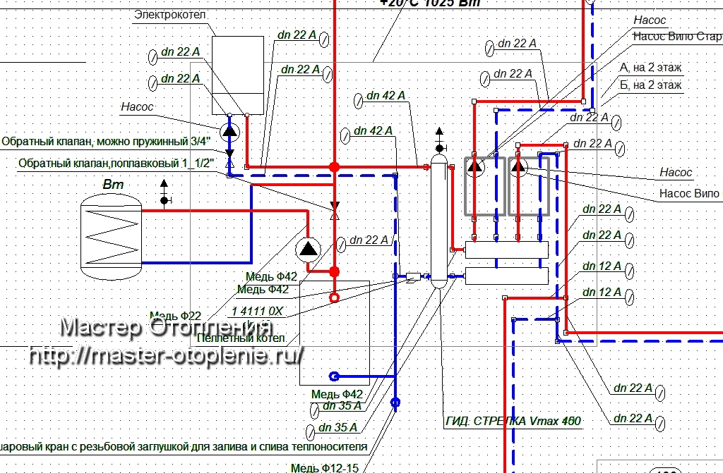 ТА-гидрострелка стоит неправильно по уровню (должен быть выше котла). И какой оно ёмкости планируется?