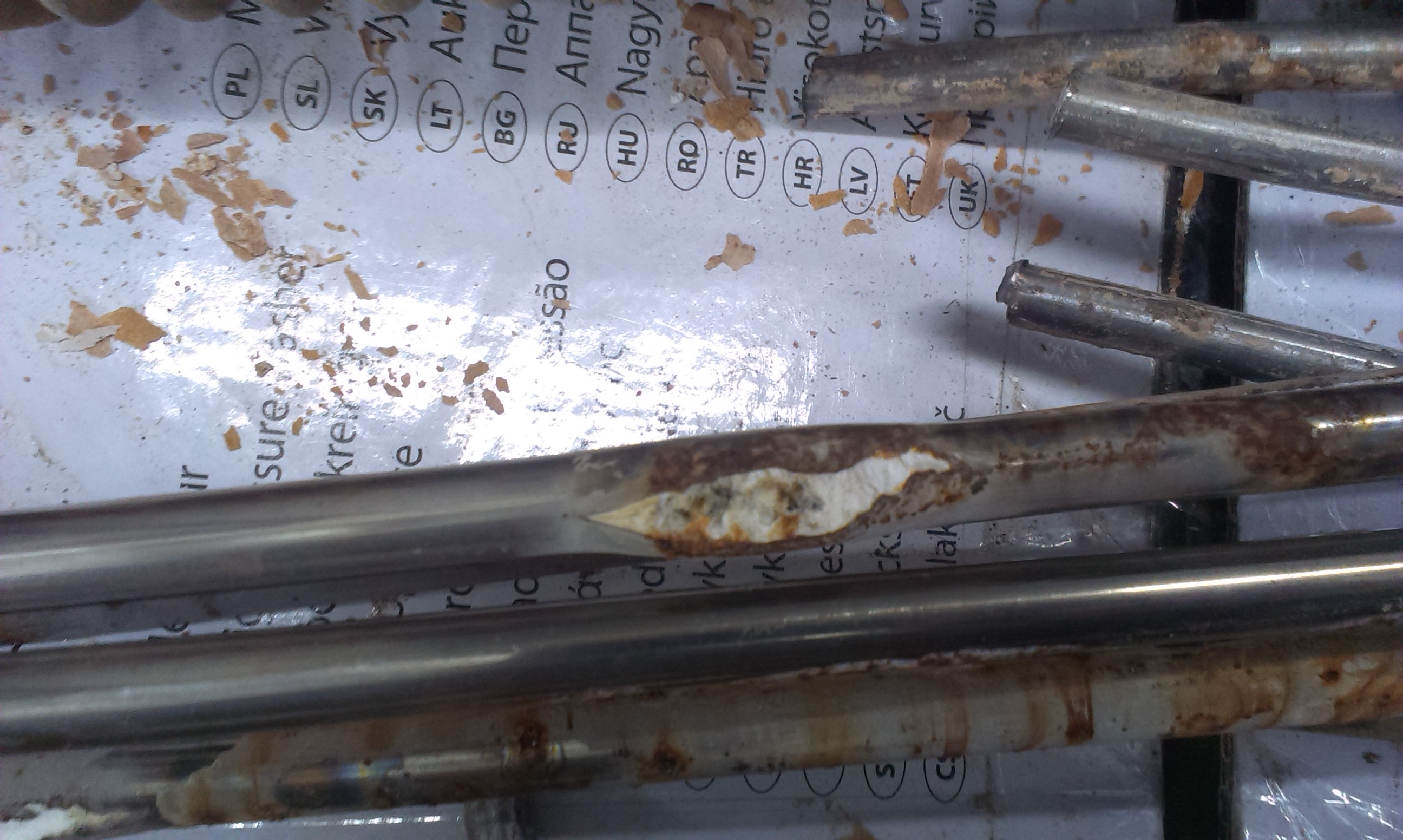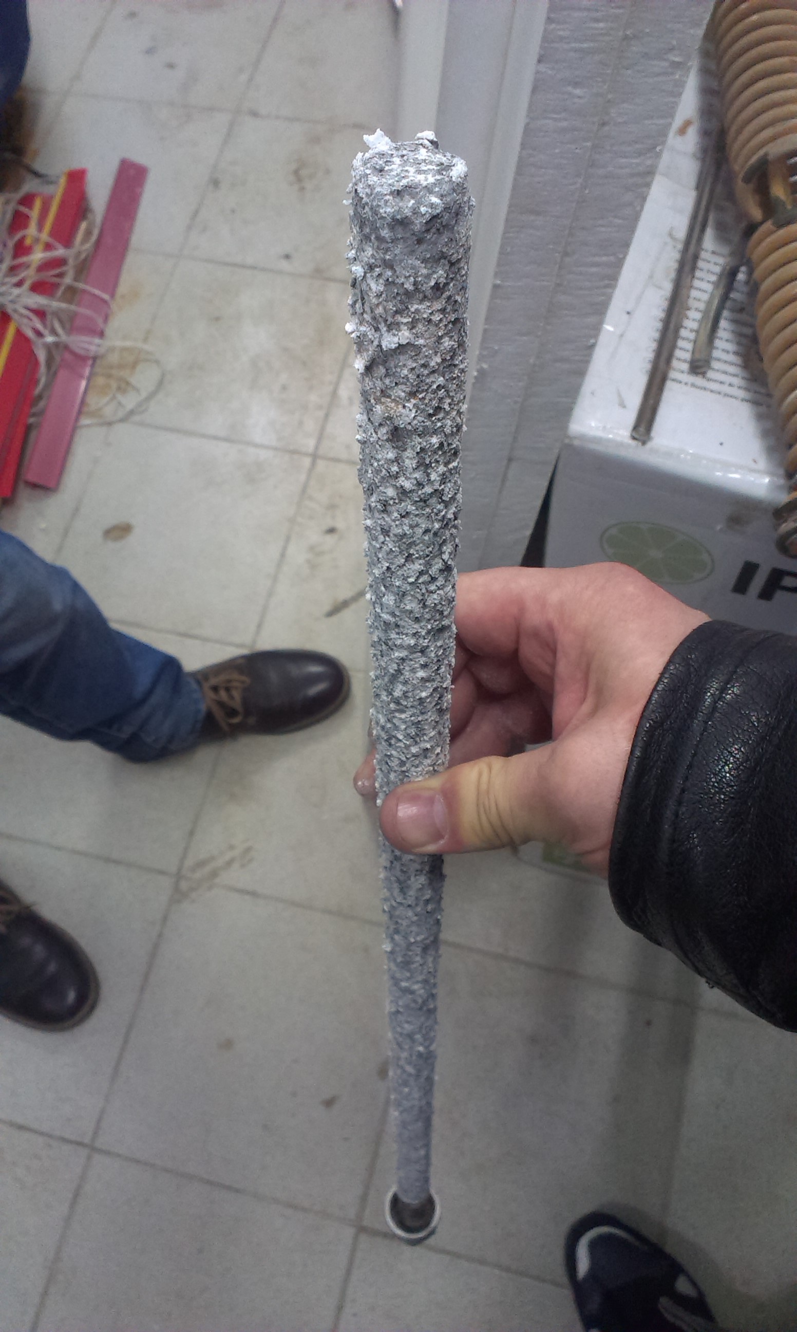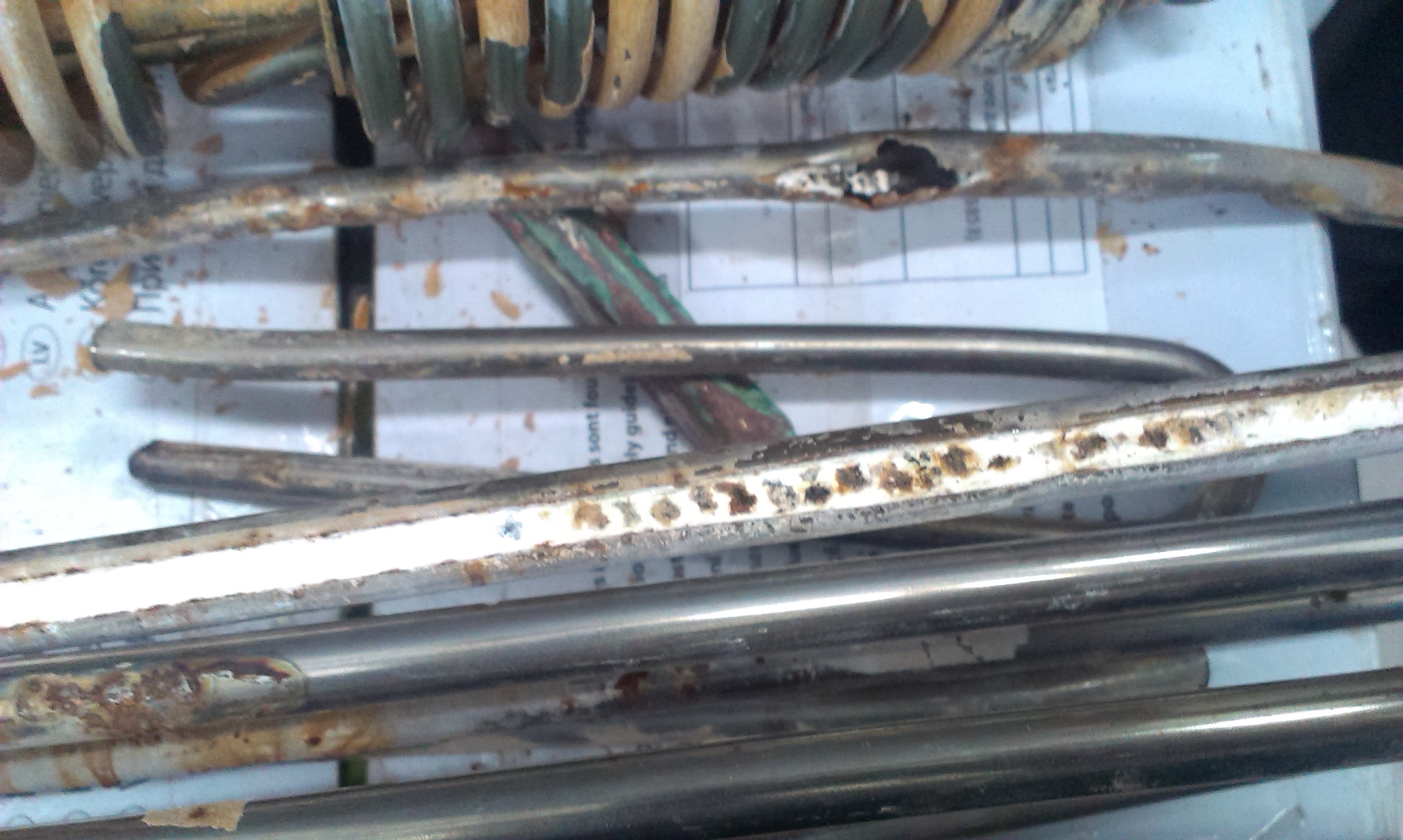 - прямой, из хорошей нержавейки, без язв, без накипи, но край пришлось отпилить и оставить в баке, не смогли достать как вывернуло.