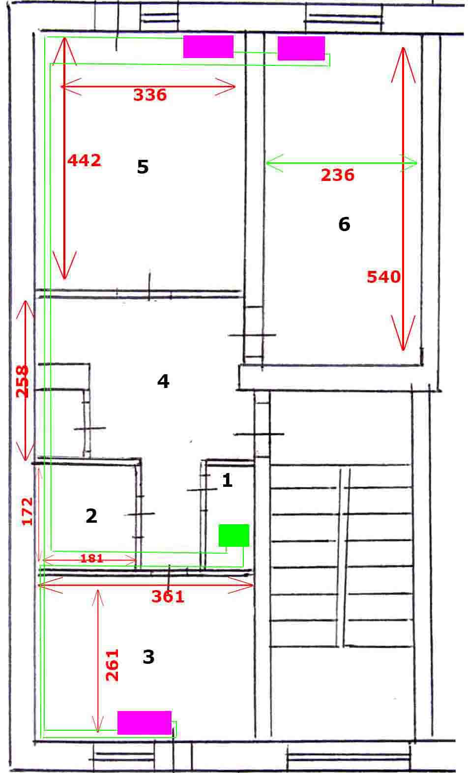Планирую приобретать электрический (газовый отпадает по закону) котел для обогрева трех радиаторов. Сам котел на схеме обозначен зеленым прямоугольником. Радиаторы-прямоугольники с сиреневой заливкой в кол-ве трех штук. Котел планирую монтировать в туалете, затем через ванную контур идет к радиатору на кухне, после через ту же ванную и коридор в зал и спальню (на схеме трубы обозначены зеленым). И возвращается обратным ходом в туалет. Примерная длина всей системы 50 м, отапливаемая площадь около 40 м2.