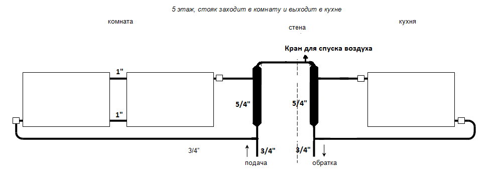 схема как на фото остается только в случае, если врезка стояков будет сделана правильно, т.е. как было изначально. Чтобы левый стояк был транзитным подающим. А правый стояк был нисходящим.