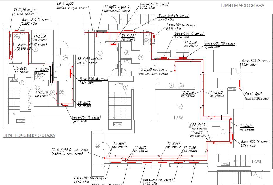 Предложили смонтировать небольшую систему отопления. Вроде подход должен быть "Делай все по чертежу..." и далее по тексту, но гложут сомнения. Больно уж странный проект нарисовали. Есть то, что называют сейчас "коммерческая встройка", дом жилой, 80-х годов постройки, отдельный элеваторный узел в ИТП на эти встроенные помещения. Большой магазин советских времен разгородили на отдельные площади, получились неравные части когда-то целого, система отопления - горизонтальная однотрубка, общая на эту часть встройки, раздел где-то - три четверти тут, остальное - у других хозяев. В оригинале в этих помещениях было 9 стальных панельных советских радиаторов, до начала в соседнем помещении еще 2, и после конца дальше еще 4. В цокольном этаже отопление не было сделано вообще. Все было разведено сталью ДУ20. Потом часть радиаторов поменяли на алюминий, часть труб переложили на полипропилен 25 мм, но в целом концепцию сохранили. В нынешнем проекте хотят от начала нашей зоны ответвиться на цокольный этаж, а по первому - добавить радиаторов, и около витрин добавить их побольше, сделав гибрид однотрубки и двухтрубки. А после этого - те же 4 радиатора у соседей остаются... В принципе, скорость в трубе ДУ20 получается около 0,8 м/с, при суммарном расходе по двум веткам порядка 0,9 тонн в час. Длина этого всего хозяйства в пространстве около 30 метров, ширина - 10, с подъемами и опусками до ИТП - суммарная длина ветки что-то вроде 80 метров. На радиаторах входные температуры 72, 68, 64, 62, 57, 55, 53 градуса, что вроде как нормально для однотрубки. То есть, в ИТП с элеватора явно выходит что-то на пределе уже сейчас, при этом на улице около 0, а в помещении - где-то +16, заказчик говорит - холодно! Изначально тут был промтоварный магазин, теперь по ТЗ должно быть 22 градуса. И вот будет ли работать тот гибрид, что проектировщики придумали - есть сомнения... Два кольца, до и после остается чужая однотрубка... У них что первый, что четвертый, что шестой радиатор (одинаковые) имеют одну и ту же теплоотдачу, при том, что температура на их входе будет явно не одна и та же, и не 95/85, как по заводским данным. В общем, стоит ли за эту авантюру браться? Как-то не хочется постфактум доказывать, что все сделано по проекту, и все претензии не ко мне, лучше уж заранее понять - может, что-то не так?