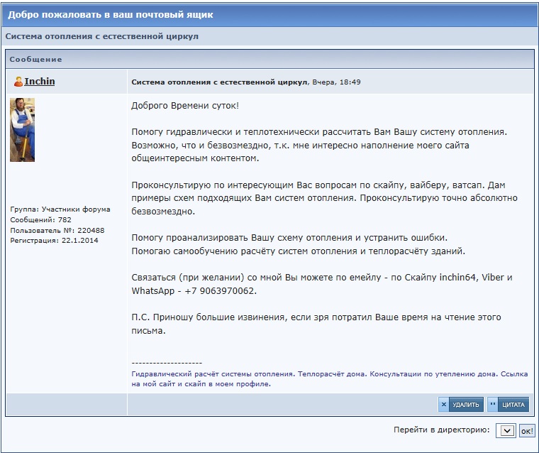 А всем остальным ещё раз повторю, что сначала этот человек отправляет сообщение, что готов бесплатно проконсультировать и даже возможно бесплатно рассчитать систему, если я создам тему на его форуме, т.к. ему это нужно для продвижения. Как только я это сделал, человек начал требовать деньги и хамить. В итоге ни обещанной бесплатной консультации, ничего. Одно враньё.