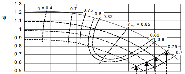 А вот на Fig. 4.18 видно, что при понижении частоты вращения максимальный КПД от 0,85 переходит к 0,82, затем - к 0,8 и так далее, в сторону уменьшения: