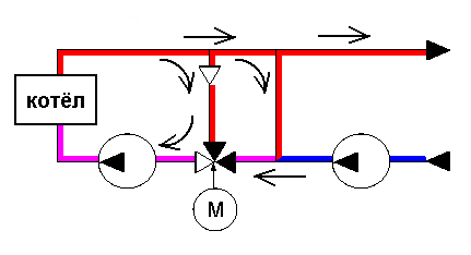 Кроме того, для "ножки" трёхходового клапана нужно рассчитать переход на меньший диаметр. Kv этой ветви для клапана с характеристикой ”равнопроцентная/линейная” должен быть ”(0,5ч0,7) Kvs клапана” и ”(0,3ч0,5) Kvs клапана” – для обычного ”симметричного” клапана. Например, для получения Kv4 можно использовать один метр полдюймовой стальной трубы. Это сопротивление позволит получить монотонно возрастающую зависимость ”Kv обеих ветвей – угол поворота”.
