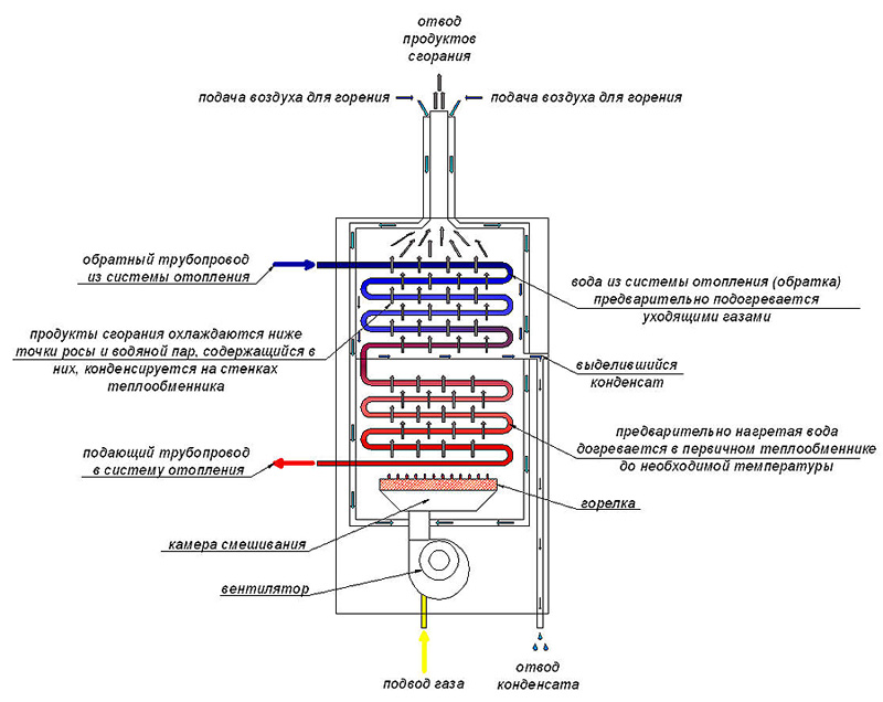 Поэтому котлы со встречным направлением движения продуктов сгорания и теплоносителя, имеют более высокий КПД, чем котлы с попутным направлением.