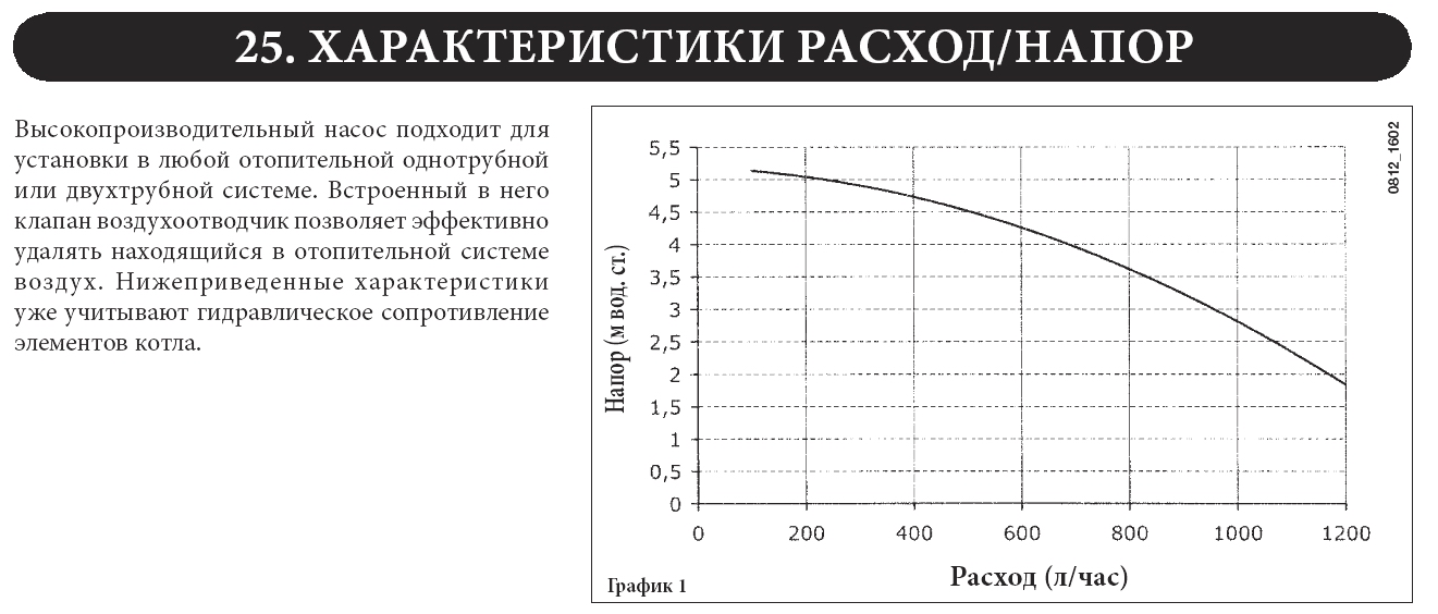 Вот ниже график характеристик насоса котла Бакси уже с учётом влияния сопротивления теплообменника. Вот и проектируйте систему так, чтобы сопротивление системы при расчетном расходе было примерно как у встроенного насоса. А при динамическом расходе в системе, устанавливайте еще и внешний перепускной клапан, если хотите добиться постоянства напора на источнике тепла и пропорциональности работы радиаторных термоклапанов и отсутствия шума в них.