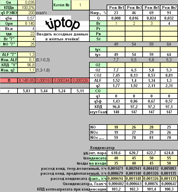 Пример расчёта в Excel КПД конденсационного котла при четырёх уровнях теплопроизводительности: