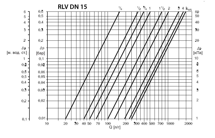 Диаграмма, показывает расход воды при повороте шпинделя клапана в диапазоне ¼ - 4 оборота и для полностью открытого клапана (Kvs)