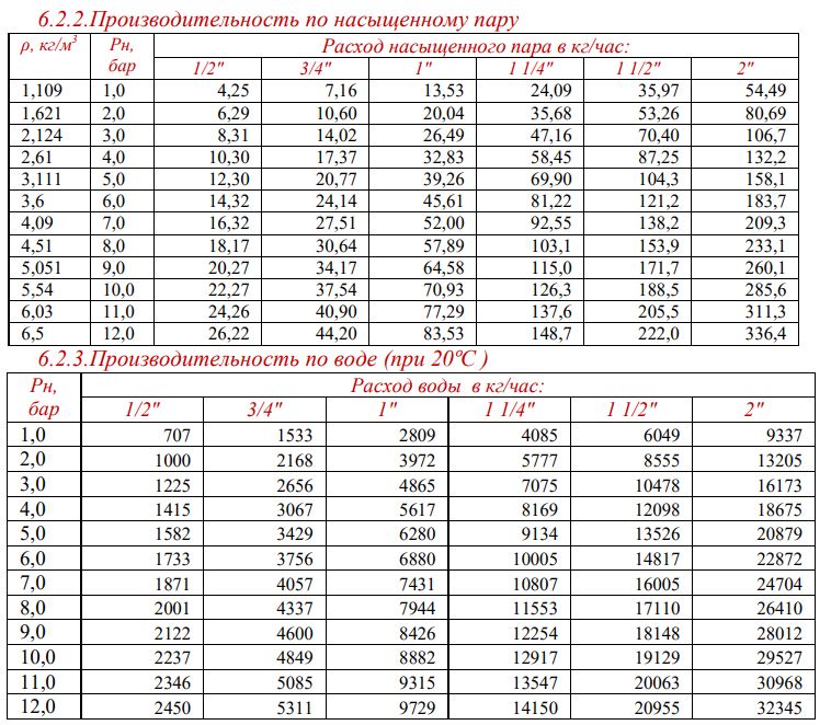 В схеме представлены данные о производительности предохранительного клапана по пару и по воде.