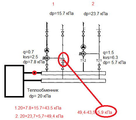 Как вы считаете, правильно ли в данной ситуации для балансировки давления установить балансировочный клапан в схеме с трехходовым? Потери давления в ветках получаются разными, 15,7 кПа и 23,7 кПа. Перепад давления на трехходовом тоже ведь не отрегулировать. Не встречал до этого на ветках с трехходовыми дополнительно балансиров. Делают ли так?