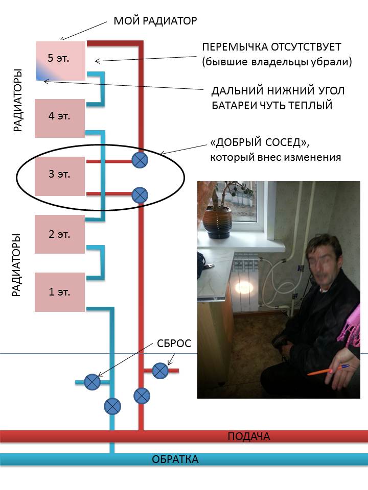 5. На верхних этажах Африка. К примеру, на наш этаж теплоноситель должен приходить +75, а приходит +60.