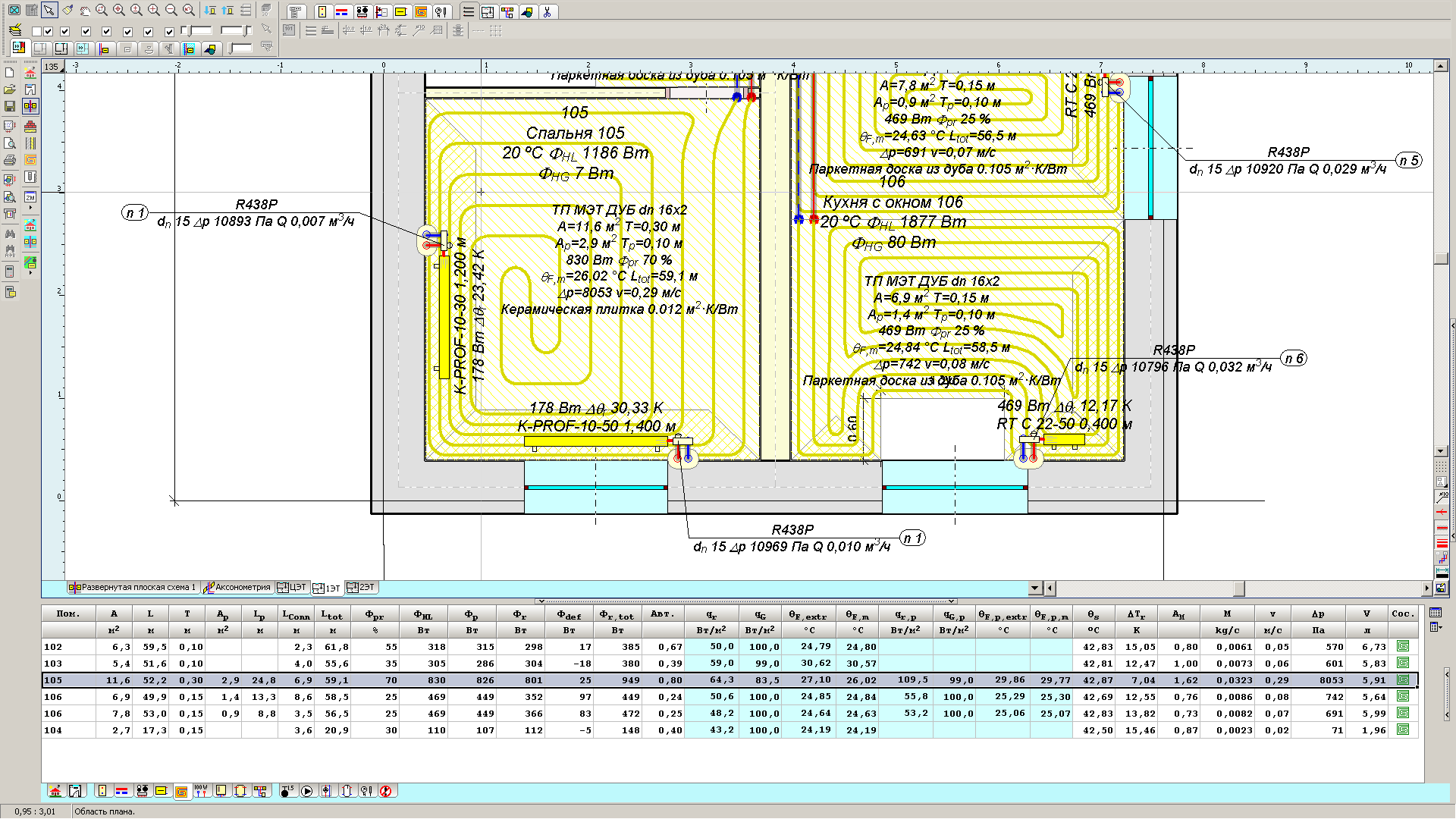 Но ведь дело то не в длине, а какие будут потери в этом контуре. К примеру ниже у меня контур длиной почти 150 метров сделанный из трубы 14х1,5мм. И его потери 4,5 кПа, что приемлемо было. Напор насоса конечно получился 44 кПа и насос восьмиметровый, но это для трех этажей с общей площадью ВТП около 500 м2 да еще водяные теплые стены. Да еще на балансировочниках сделал падение давления около 10 кПа.