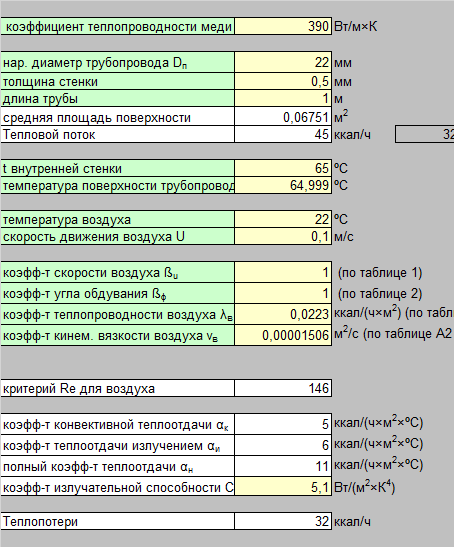 Пытаюсь рассчитать какой поток тепла будет отдавать отрезок медной трубы, длиной 1 м, диаметром 22 мм. Теплоноситель - вода, с температурой 65°C. Температура воздуха в комнате 22. За основу беру формулу, P=K*F*Δt. Где P - поток тепла, ватт; F-площадь трубы, м²;Δt - перепад между температурой теплоносителя (вода) и температурой воздуха в комнате, °C. Получается F = 0.007 м²; Δt = 43°C. Нужно определить K (коэффициент теплопередачи). K=1/(δ/λ), где δ - толщина стенки, м, составляет 0.0005 м (0.5 мм); λ - коэффициент теплопроводности меди, составляет 394 Вт/(м*К).