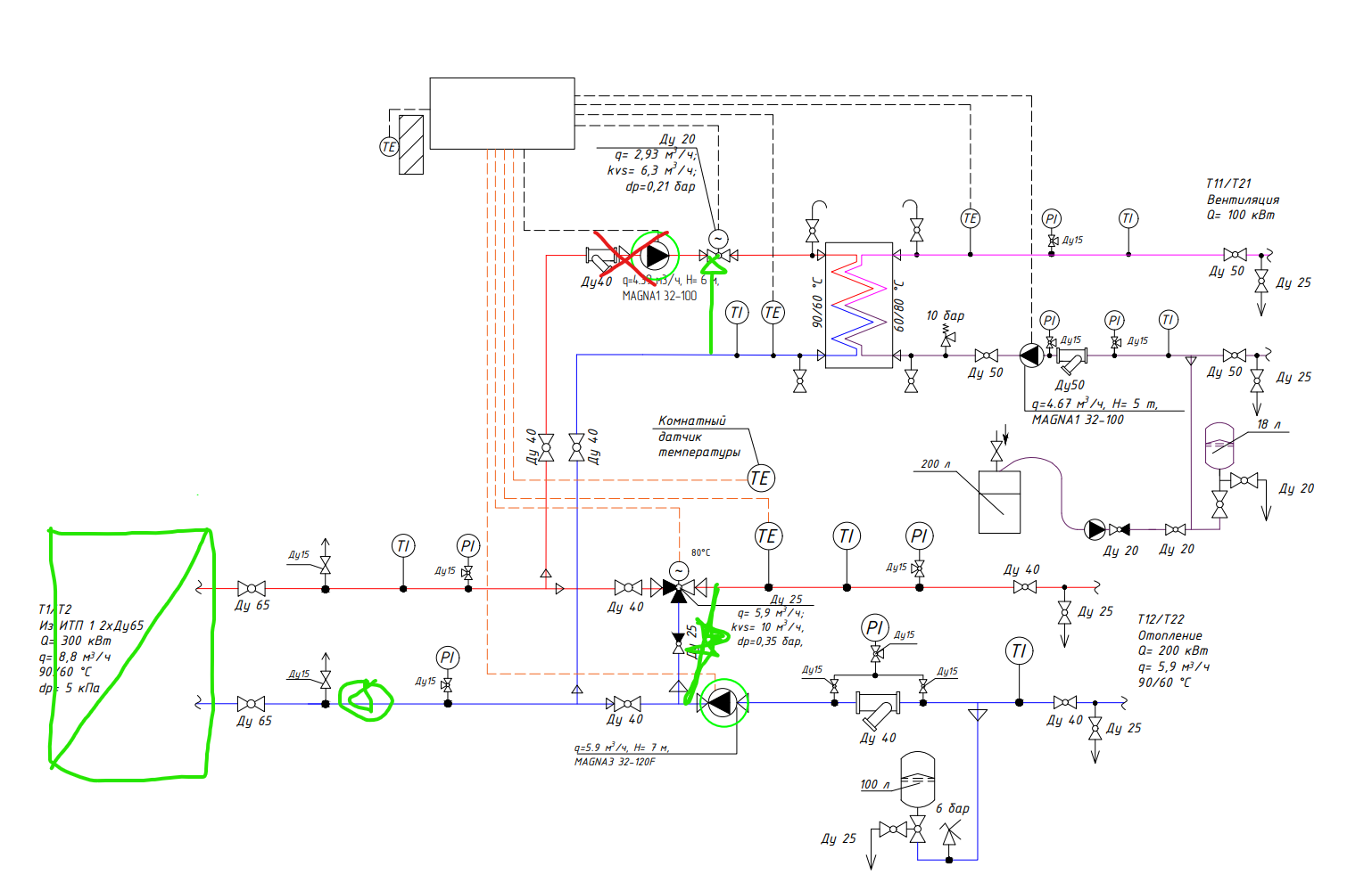 В соседнем здании через 5 метров находится главный ИТП. Там стоит только теплообменник и имеется просто ответвление с кранами на данный ИТП, схема которого приложена.