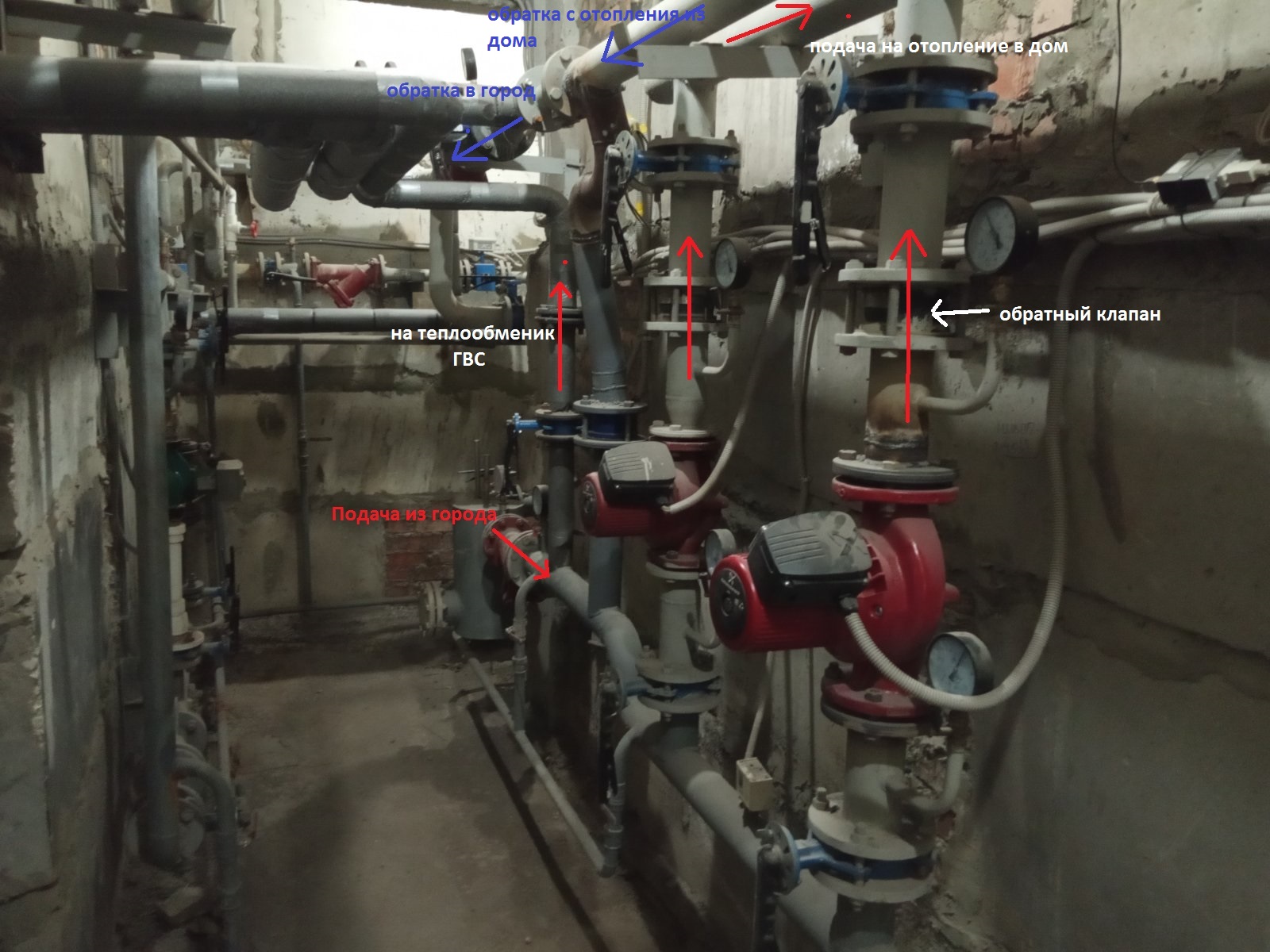 температура из города 73,8/49,2 температура в отоплении 60,9/50,6 на улице -13 давление из города подача 5,7-5,8 обратка 5,4-5,6 значения немного плавают, давление на входе в насос 5,8 на выходе 6,3- 6,4. давление на гребенке с 3 по 14этаж - 6-6.1 и на входе и на выходе, давление на гребенке 1-2этаж- подача 6,4 обратка 6