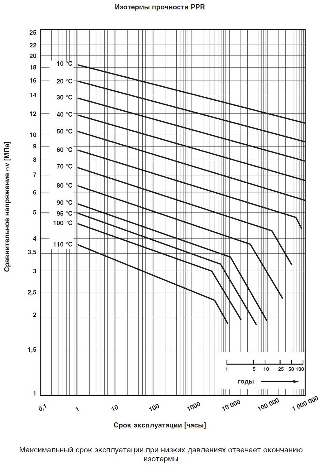 Года два-три уже не смотрел табличек. Где производители указывают гарантийный срок службы труб ППр в зависимости от двух факторов, температуры и давления. Была тогда вот такая информация.