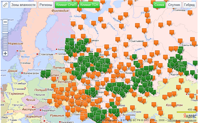 Теперь на карту нанесены зоны влажности по приложению В СНиП 23-02-2003 "Тепловая защита зданий"