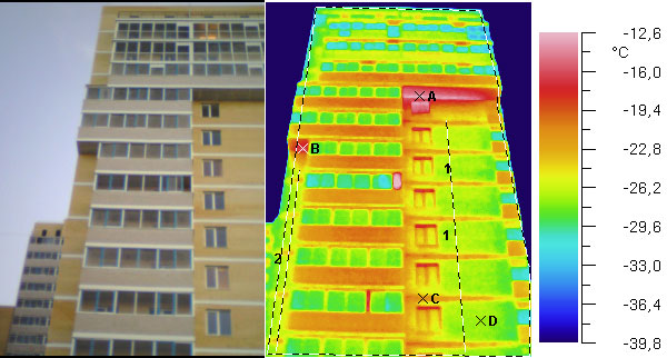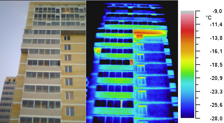 А в самих квартирах тепло? Просто могли окна на балкон открыть, чтоб попрохладнее было. А могли и вообще ничего не делать, просто небо в кадр попало и всё интересное скопилось в красной зоне шкалы. Можно как-то обрезать небо и пересчитать термограмму? Просто на улице минус 21, а шкала от минус 10 до минус 40 °С...