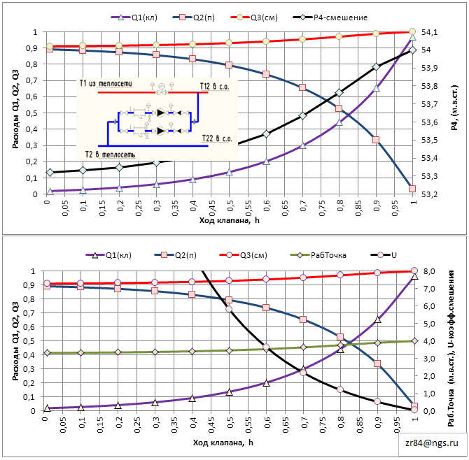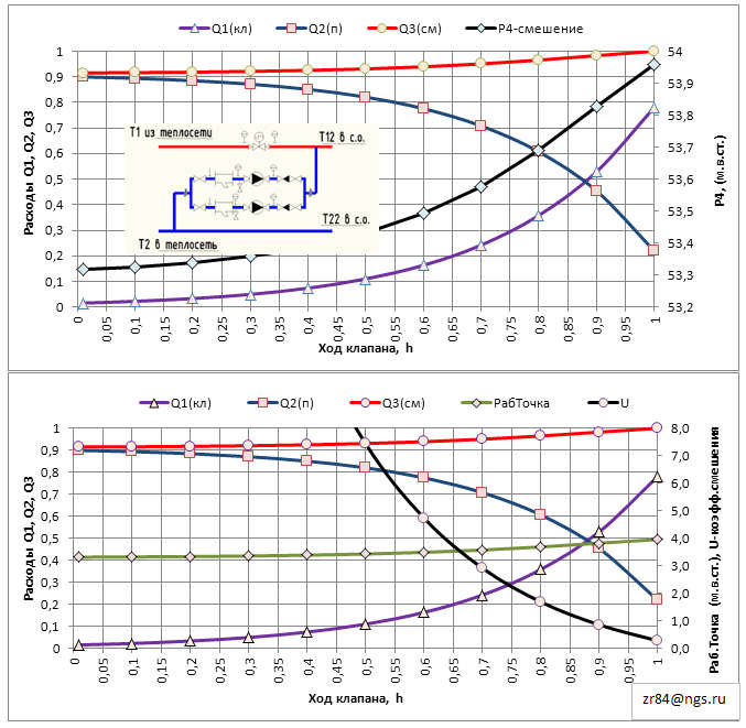 А как работает схема с насосом на перемычке... можно пьезометр?.. а в зоне верхней срезки графика?... как подбирать насос?... двухходовой клапан имеет постоянное сопротивление от степени открытия?... а какая должна быть характеристика клапана для успешной работы "пары"... насос на перемычке - двухходовой клапан на "впрыске"?