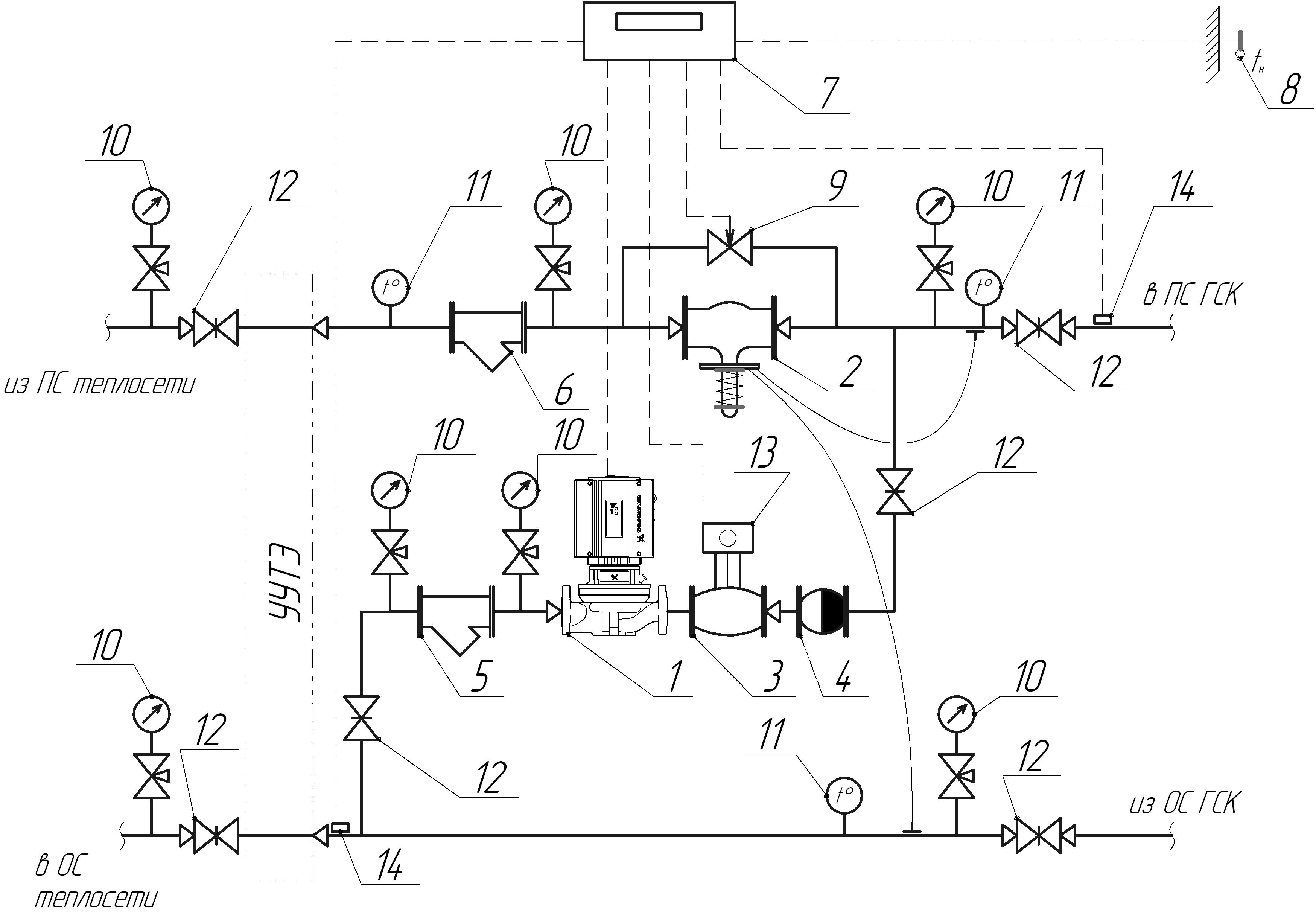 Нет, насос на режиме постоянного напора, поле регулирования у него огромное. Технически не совсем красиво, но надёжнее, чем рулить частотой от температуры. Самое важное - чуть что, то вся эта карусель исчезает и не мешает работать в аварийном режиме ничему.