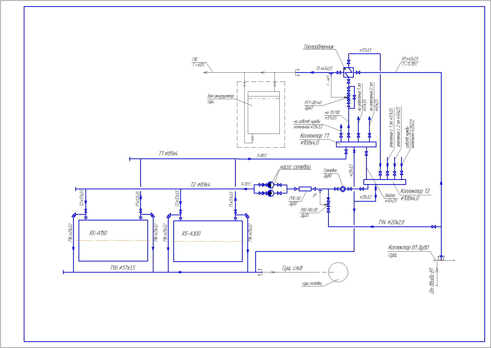 Прилагаю схему автономной котельной: отопление и ГВС. Были паровые котлы - заменили на водяные. Мощность устанавливаемая от.+вент.=300 кВт., ГВС - 150 кВт, грубо.