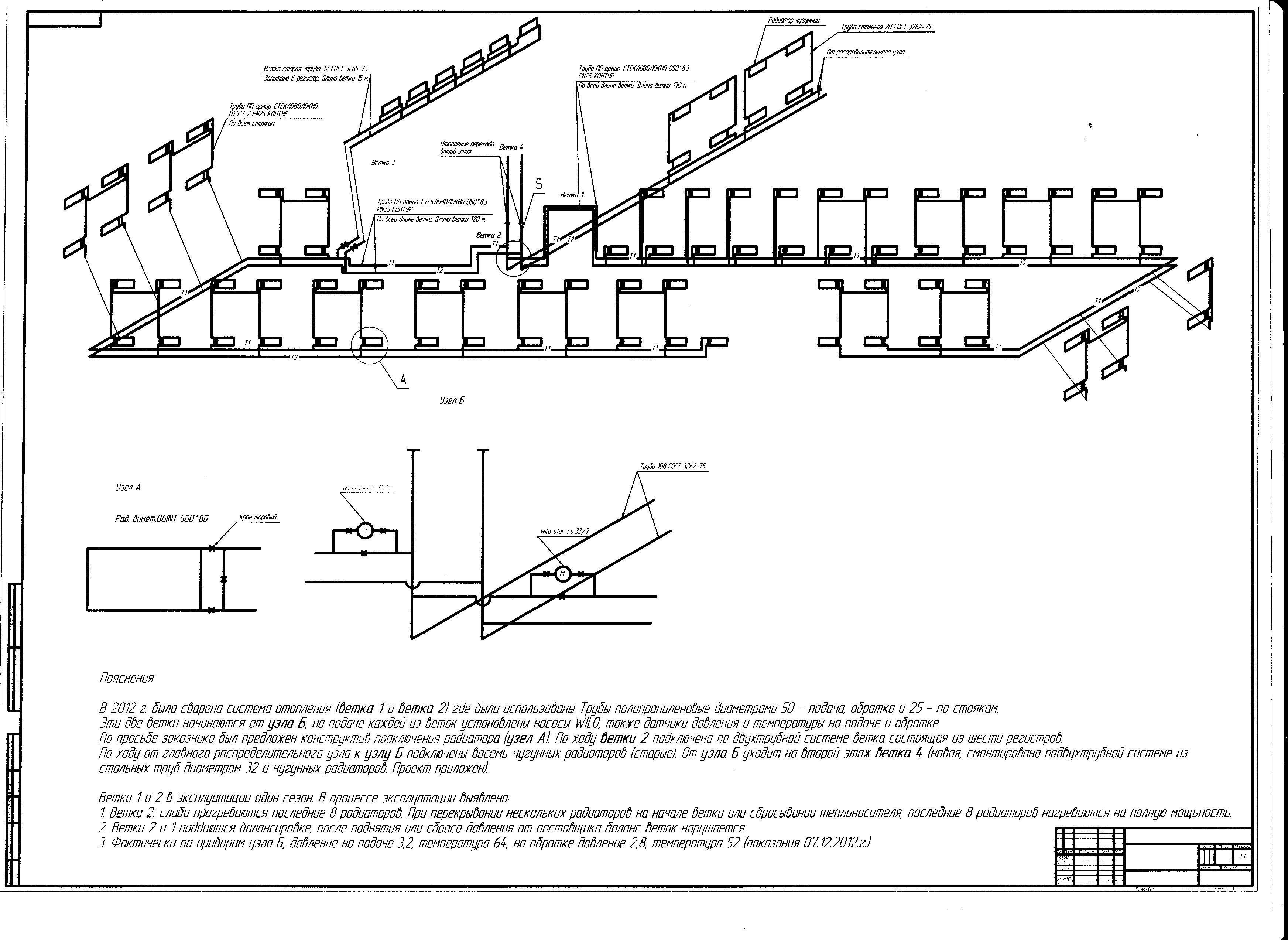 Доброго времени суток. Коллеги! Есть вопрос по системе отопления поликлиники. Материалы обсуждать не надо, т.к. система не соответствует Санпину, но она уже в действии. Есть проблема по второй ветке, не греют на полную мощность последние два стояка. Нижняя разводка ПП Д50 по всей длине, стояки ПП Д25. Радиаторы биметалл. Длина ветки 120м. В приложенном файле проблема описана.