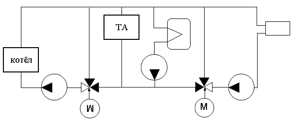 Гидравлический разделитель ставиться на водотрубных котлах, для поддержания постоянного расхода воды через котёл независимо от изменения расхода в системе отопления. Фактически 2-х контурная схема со смесительным теплообменником.