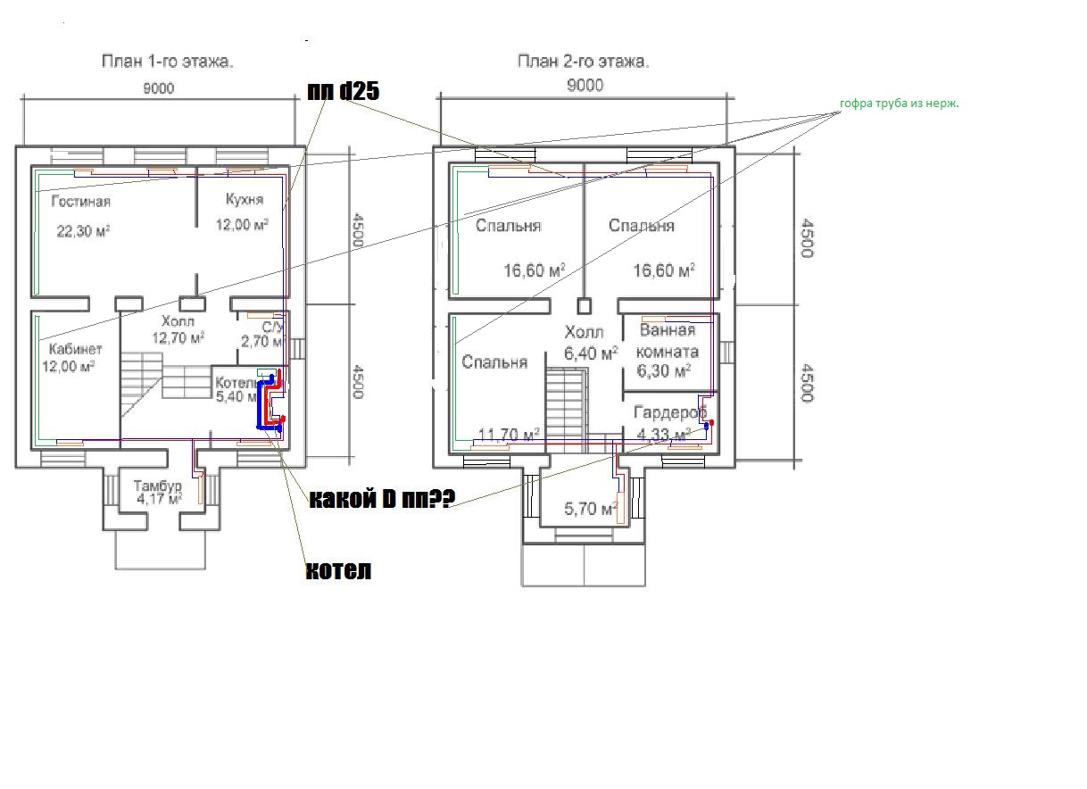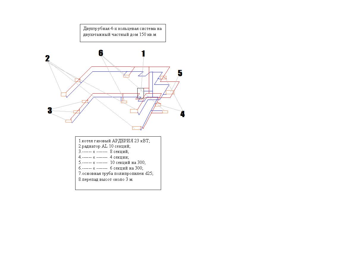 Привет всем пользователям и гостям форума. Построена коробка дома, нижний этаж шлакоблок толщиной в 1, второй этаж пеноблок толщиной в 0,5, перекрытия ЖБИ, наружная часть отделана металлосайдингом с утеплением из пенопласта толщиной 100 мм, сейчас заведен газ и установлен двухконтурный газовый котел АРДЕРИЯ 23.3 кВт, осталось дело за отоплением. Хочу сделать ленинградку или 2-х трубную с 4-мя "крыльями. Но так как профан в данном вопросе, нужно мнение спецов. Накидал следующие схемы: