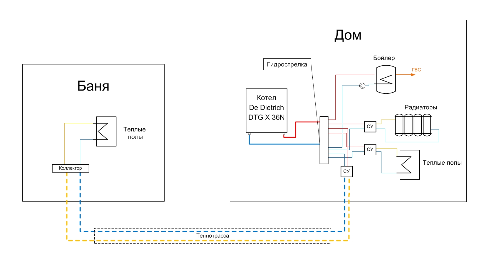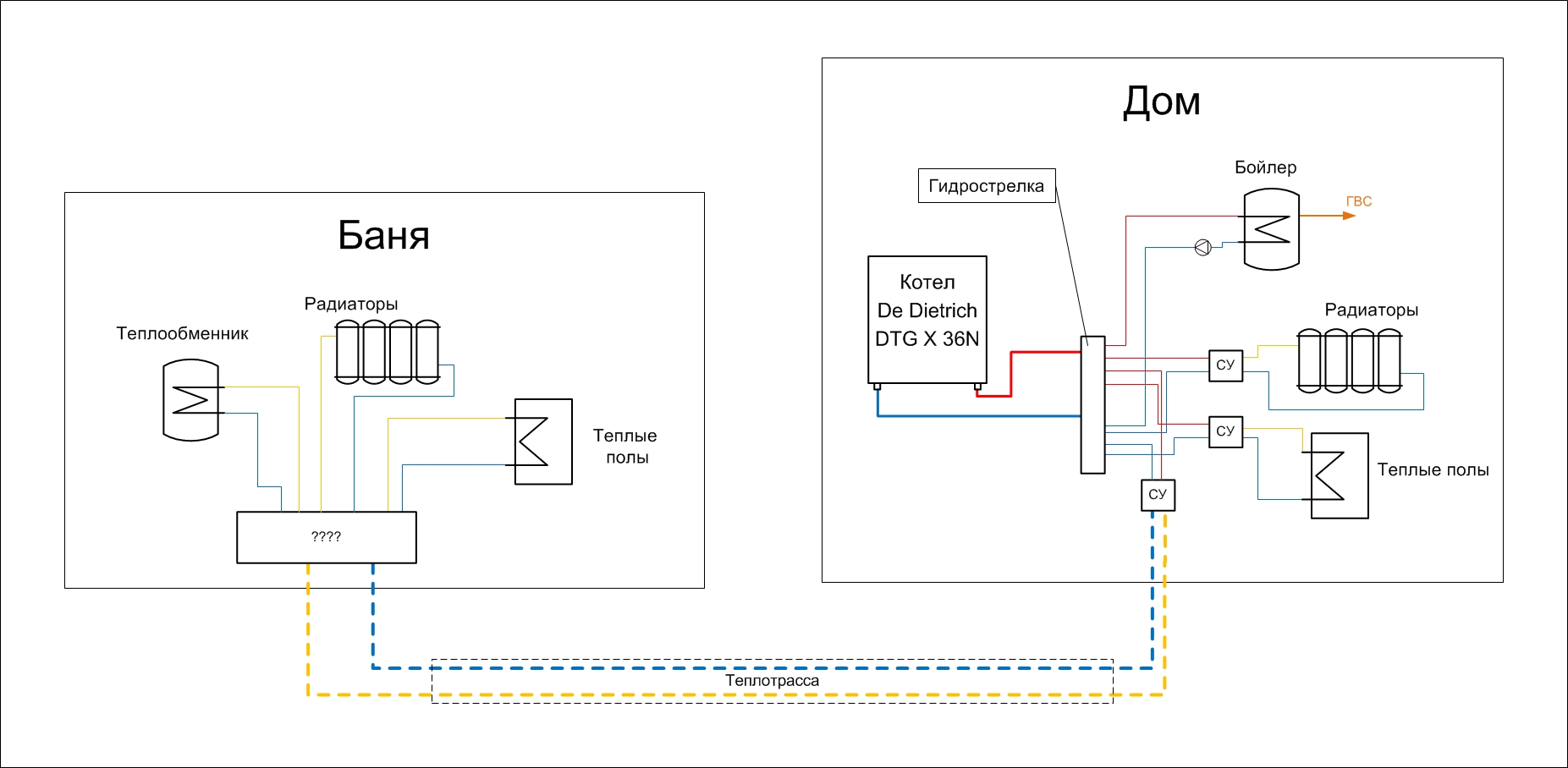 Имеется работающая система отопления коттеджа и бани (см. рисунок1).