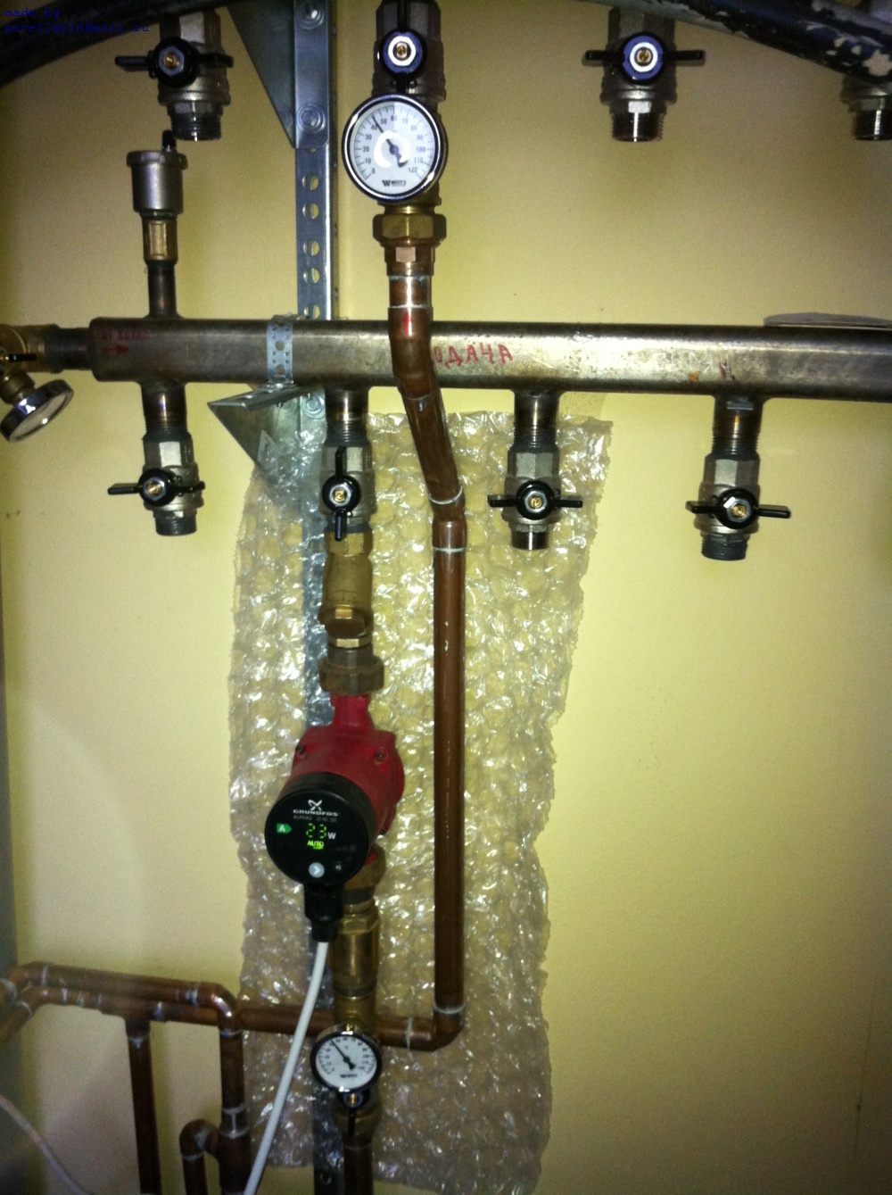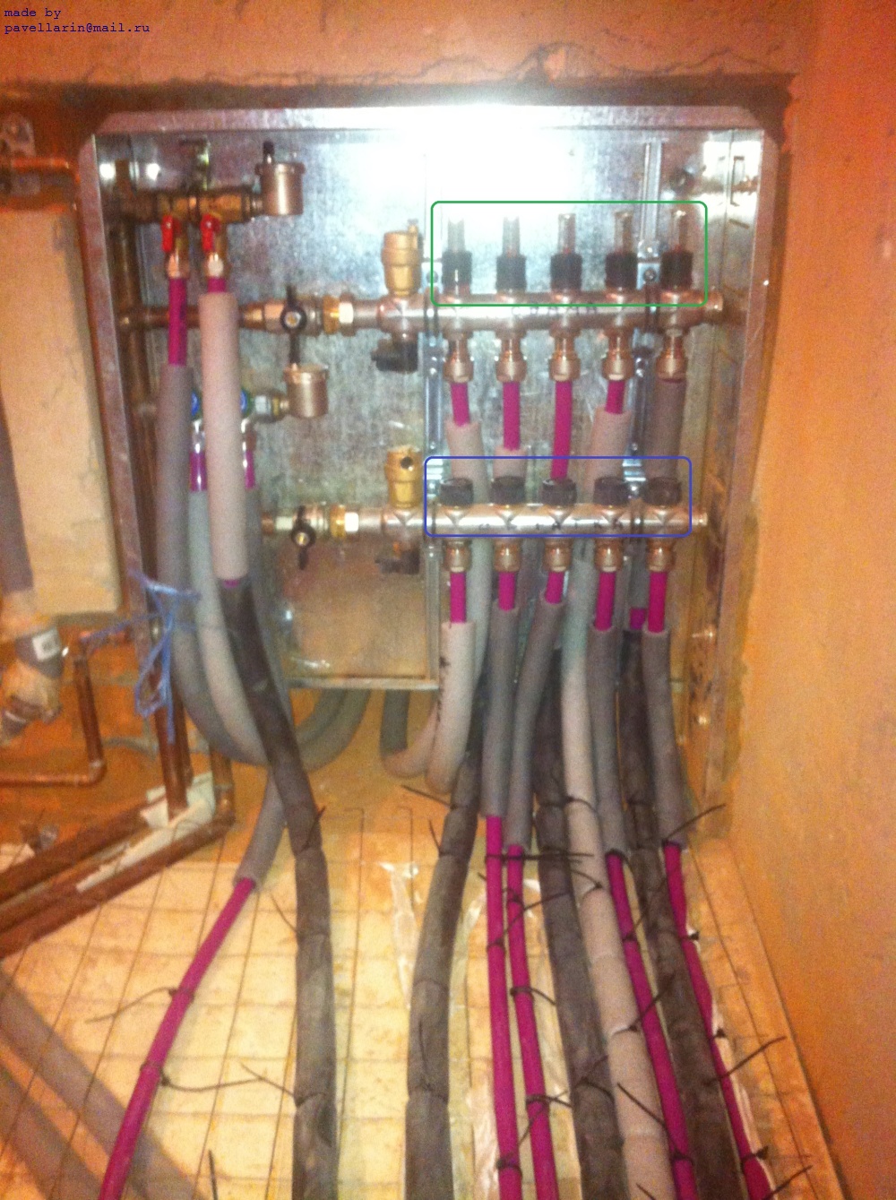 В доме уложено 5 петель, их длины 68+82+93+79+46м. Труба Rehau-pink 16. Уложены улитками. Подключены через коллектор, подвод к которым выполнен медной трубой 20мм.
